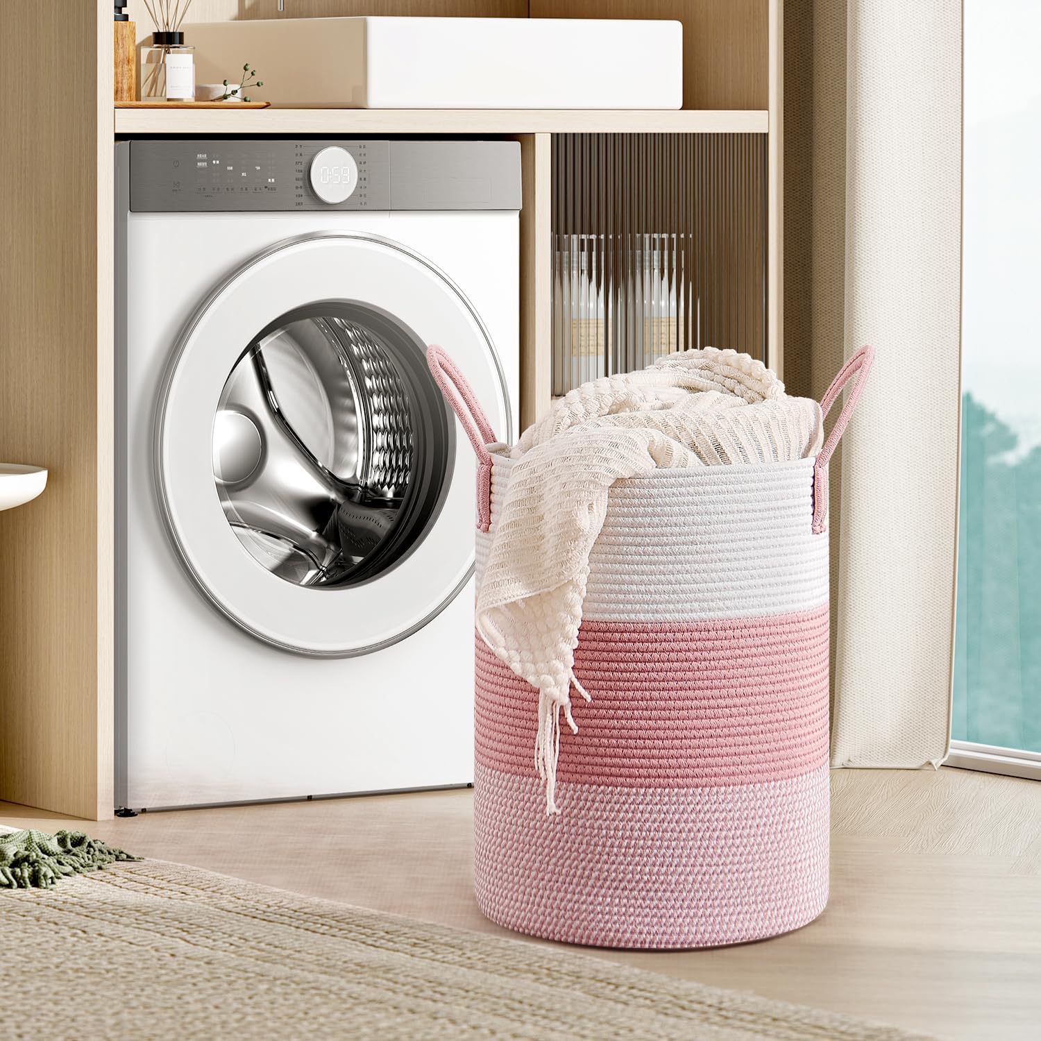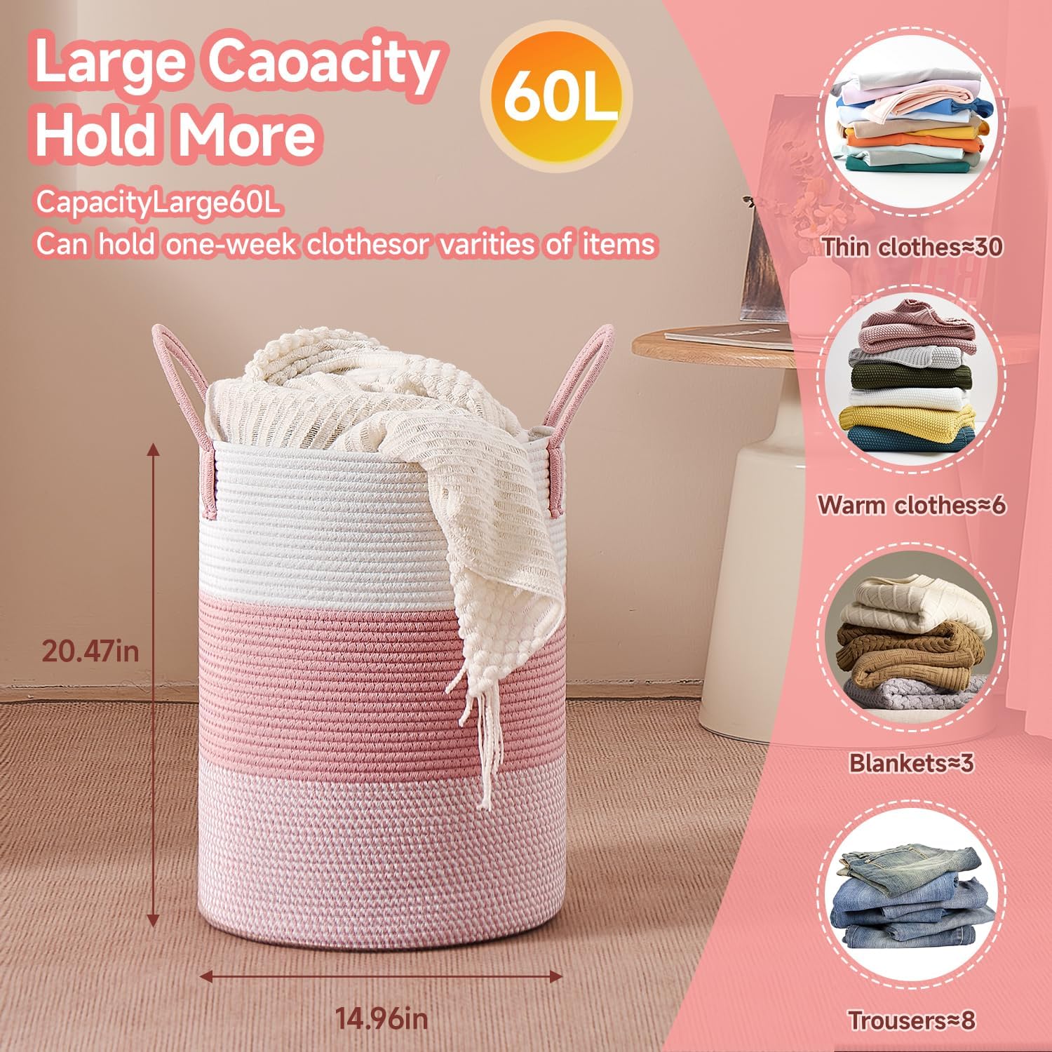 CLHMILY&Z 60L Laundry Basket Round Storage Rope Basket - 15x20.5 Inches - Pink Hamper in Bedreoom and Cute Storage Bin for Blankets, Toys, and Nursery Essentials