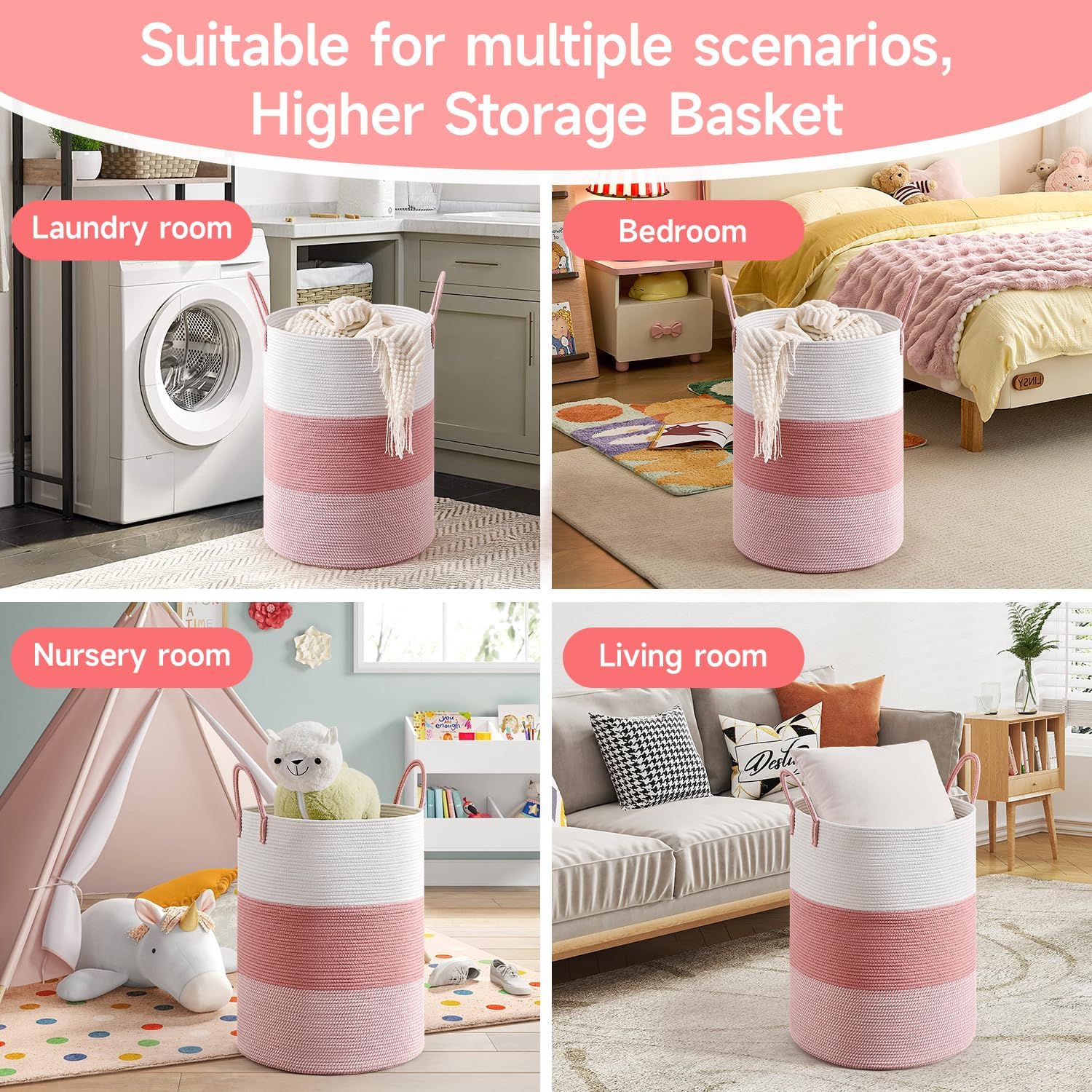 CLHMILY&Z 100L Laundry Basket Round Storage Rope Basket - 18.1x24 Inches - Pink Hamper in Bedreoom and Cute Storage Bin for Blankets, Toys, and Nursery Essentials