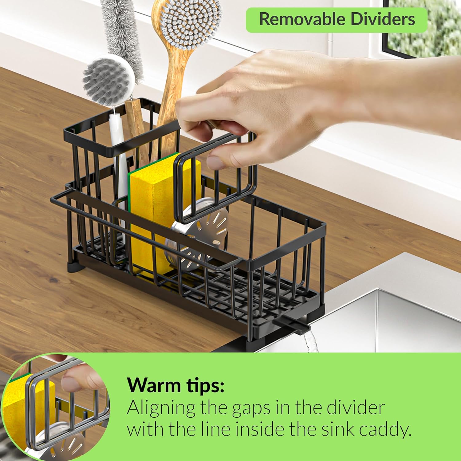 - ăReasonable Divider DesignăKeep your kitchen neat and clean with our sink organizer featuring an ergonomic divider design. The three separate compartments of sponge holder for the kitchen sink ensure better organization for your brushes and Sponges