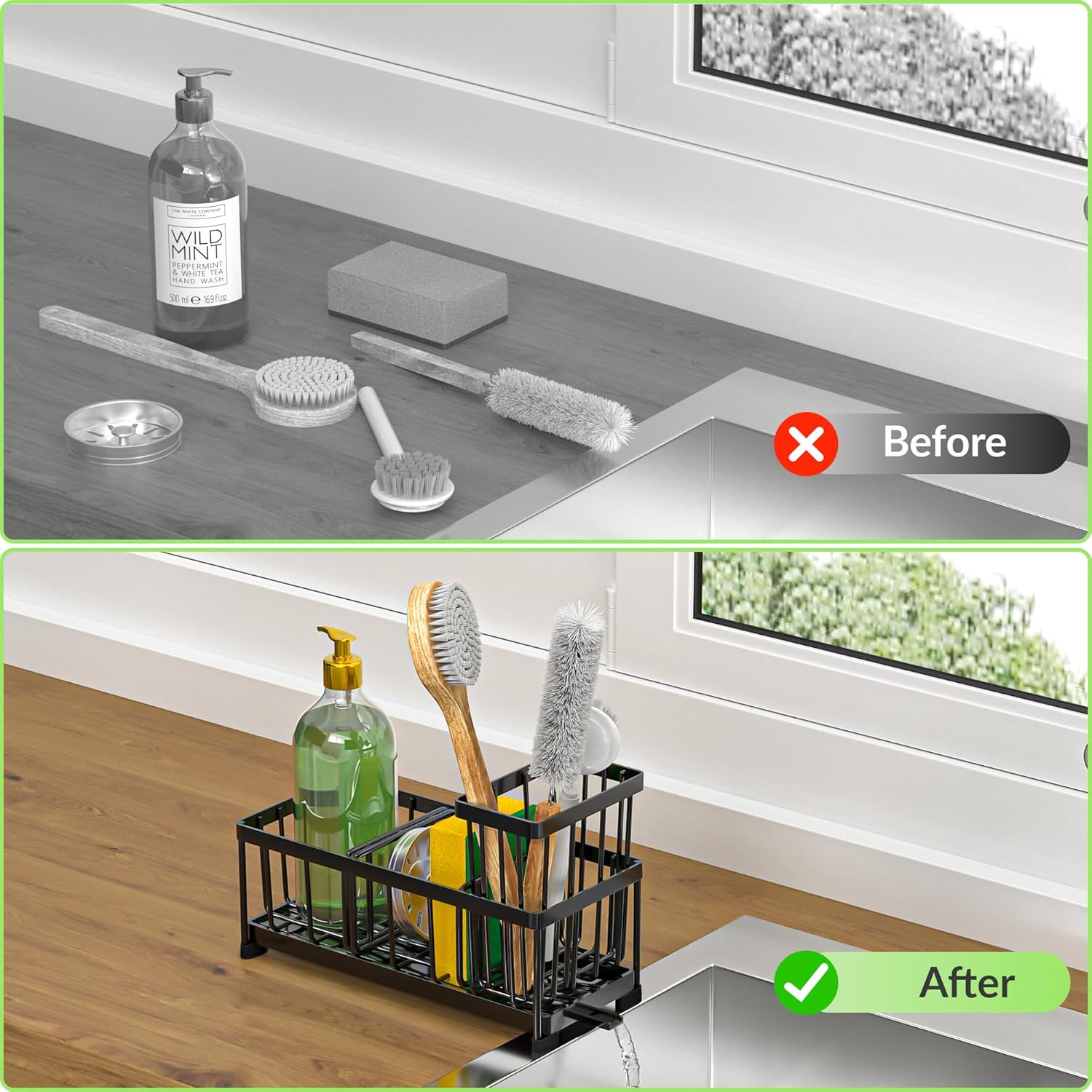 - ăNo Installation RequiredăOur Sink Caddy is ready to use- straight out of the box without any installation requirements, This kitchen sink organizer fits into any kitchen decor, offering a sleek and functional solution.
