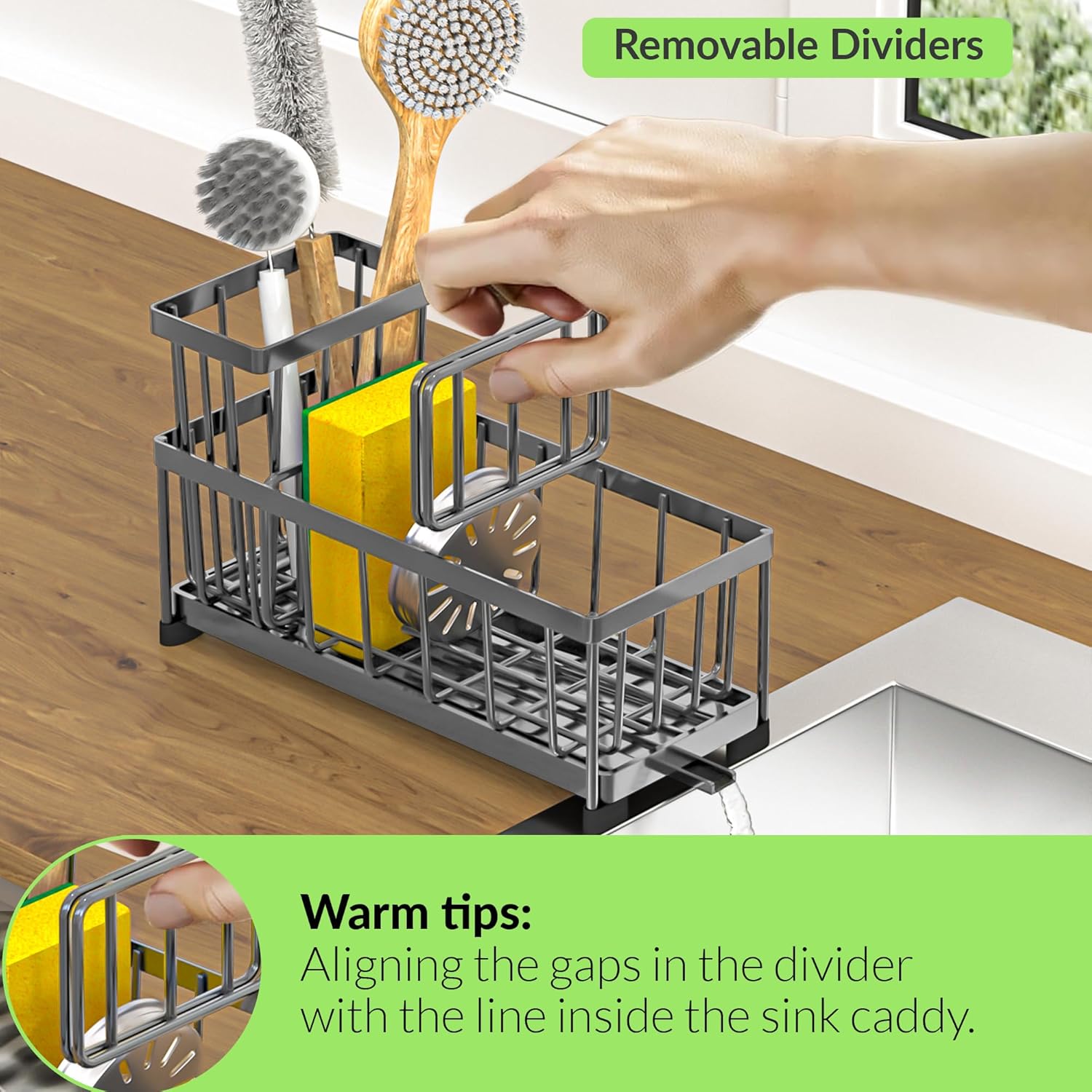 - 【 Stainless Steel Material】Made from durable 304 stainless steel, Our Sink Caddy is rust-proof and built to last. Its anti-rust coating can withstand constant water exposure while maintaining its sleek—ideal sponge holder for kitchen sink.