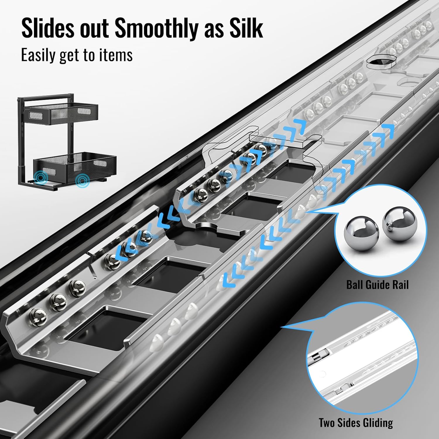 - Silk-Smooth Gliding with Dual Ball Bearings – Effortlessly pull out & in heavy items (up to 20kg) thanks to ultra-smooth dual-track ball bearings, tested for 10,000+ cycles. Our under sink organizer is 70% smoother than standard slides even when the racks are fully loaded.
