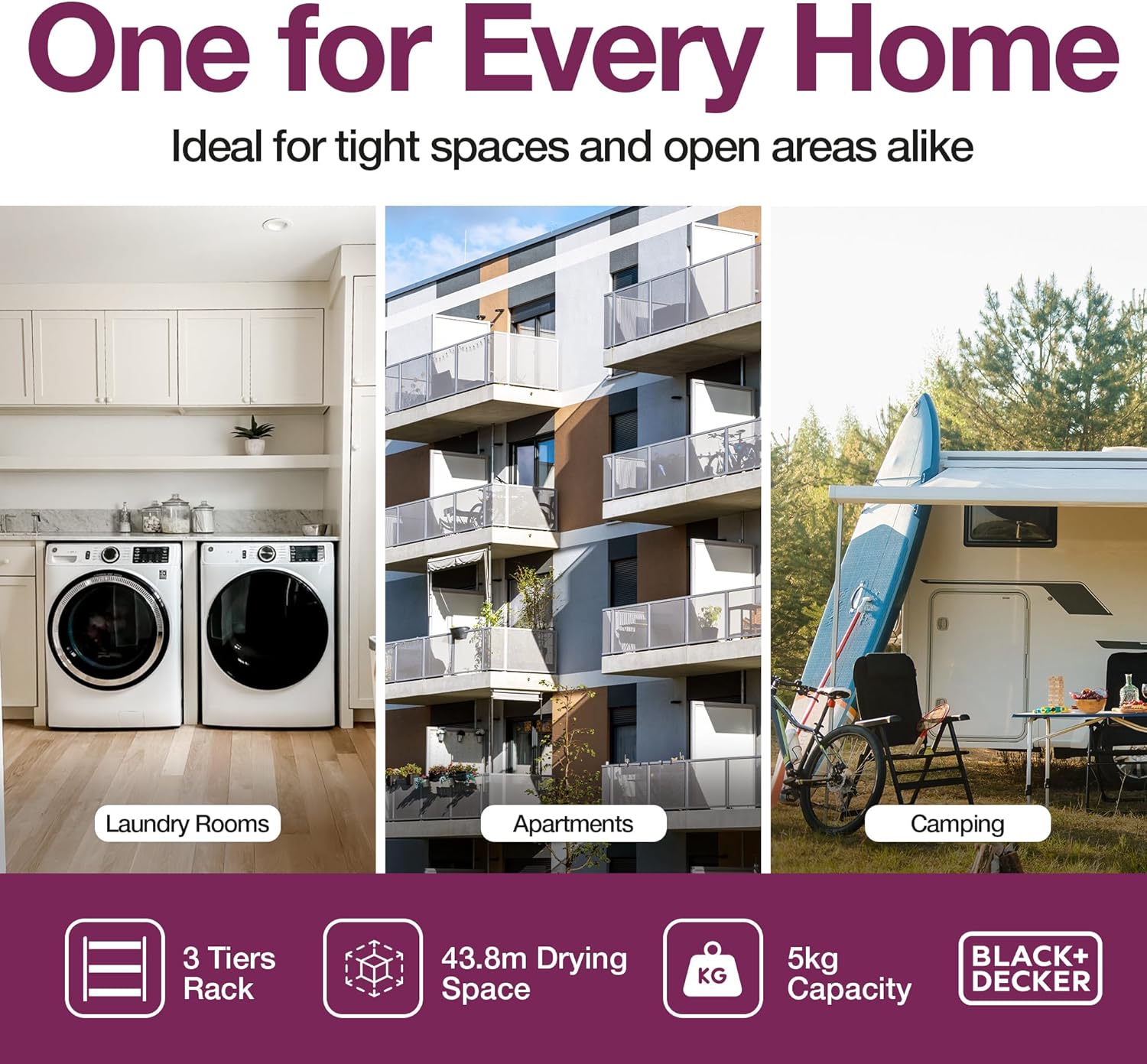 - Ample Drying Space with 3 Tiers: Equipped with 6 rods and 2 hooks, providing 43.8m of drying space while maintaining a slim profile for small spaces.
