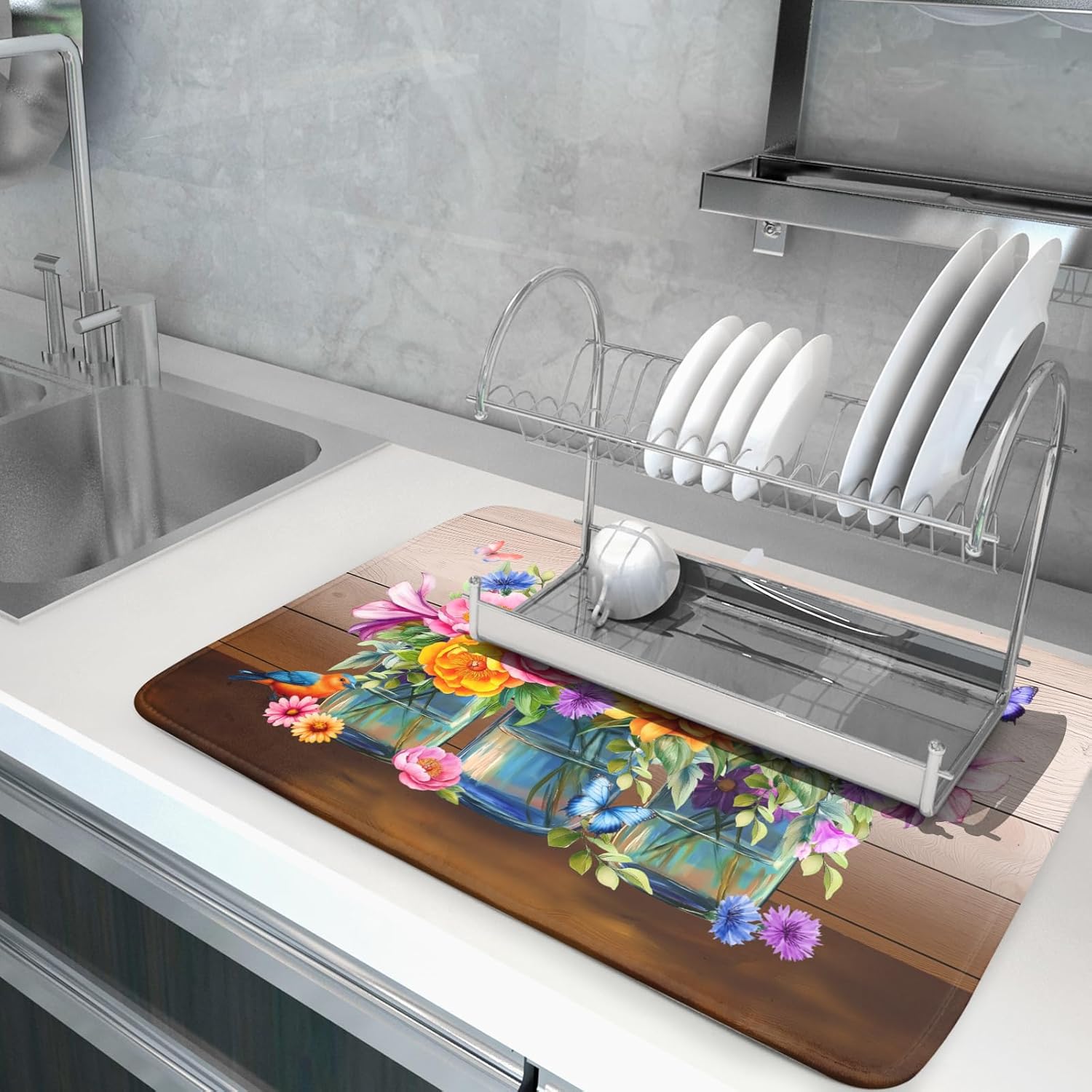 - 【Fashion Design】Our Spring decorations drying mat is customized with single-sided printing, one side is takes Spring seasonal as theme, printed with design colorful flowers and butterflies pattern, does not fade, perfect functional addition to your kitchen decor, fitting well and tightly on most counters. Prepare the best holiday present for family and friend, housewarming parties, weddings, birthdays, Easter Day and Spring.