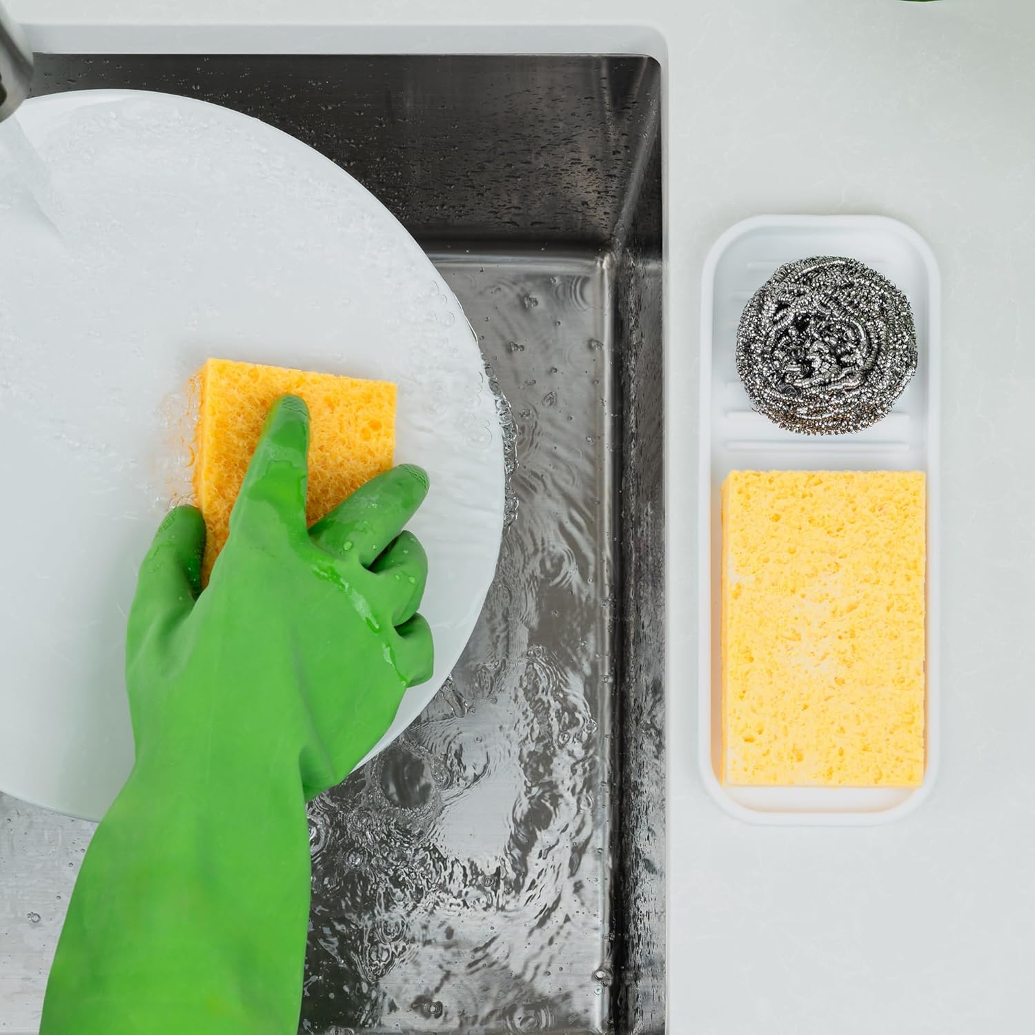 - MESS-FREE KITCHEN: Effortlessly keep your sink and kitchen countertop free from soapy residue with our sponge holder. With a size of 3.5 x 9 inches, this silicone tray is ideal for holding a cleaning sponge, brush, scrubbers, dish soap bottle, hand soap bar, and silverware. You can also use it in your utility rooms, bathroom, laundry area, and even your vanity.