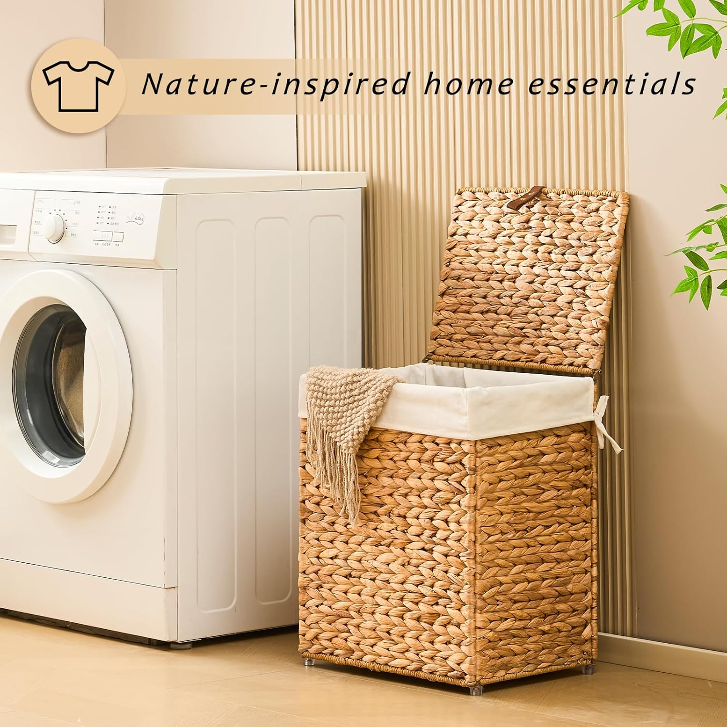 Handwoven Laundry Basket with Lid, Natural Water Hyacinth Storage Basket with Handle, Removable Cotton Liner, Durable and Stylish for Bedroom, Bathroom, Laundry Room