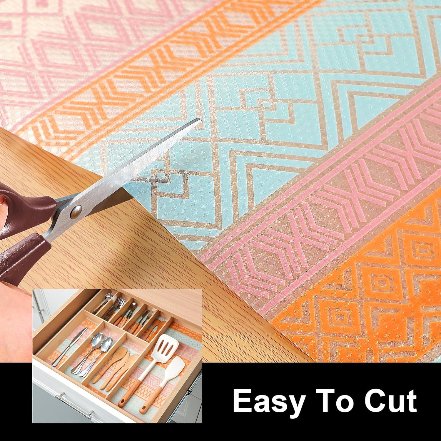 - EASY TO INSTALL AND CUT: The cabinet liners are easy to cut. You can easily trim them into the desired shape with scissors, place them on a drawer or table, and trim off any excess material. Our drawer liners are non-adhesive and easy to remove.
