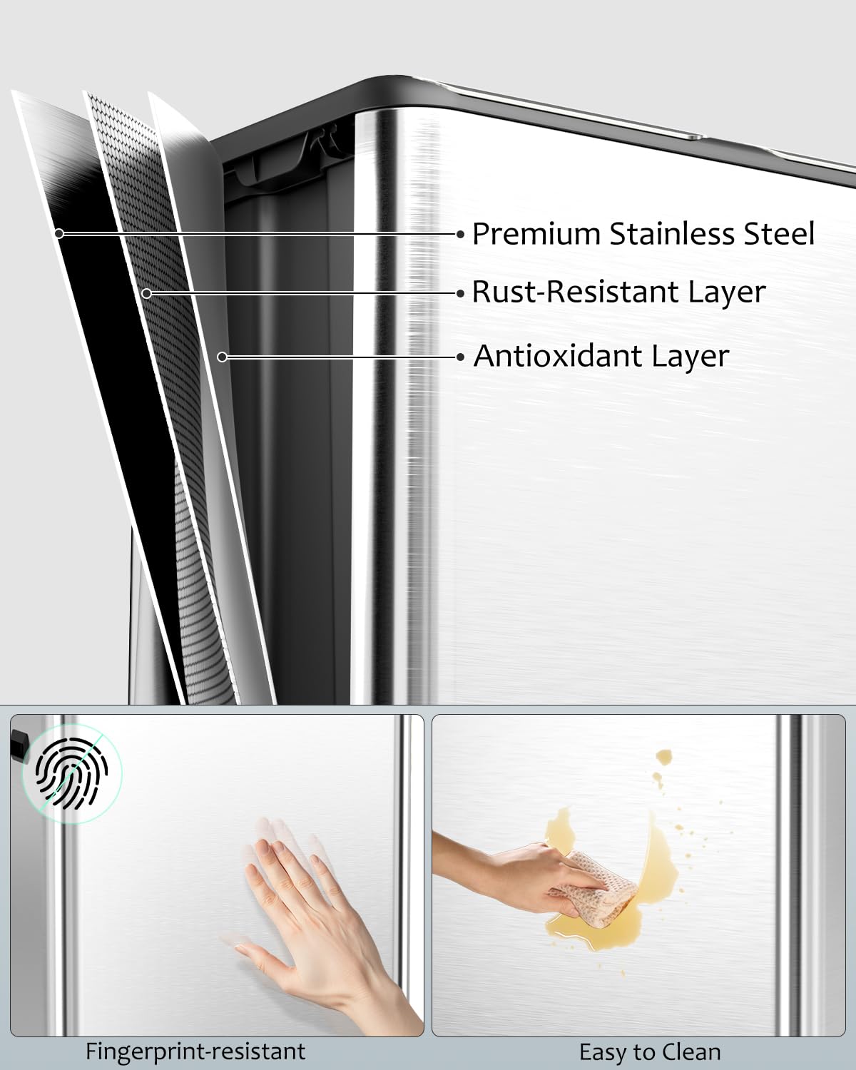- Premium Materials: Kitchen trash bin features a sturdy stainless steel exterior, ensuring durability and anti-fingerprint. Inner barrel is made of ABS plastic, which is strong and light in weight. Surface is easy to clean, stylish appearance makes it fit any home style