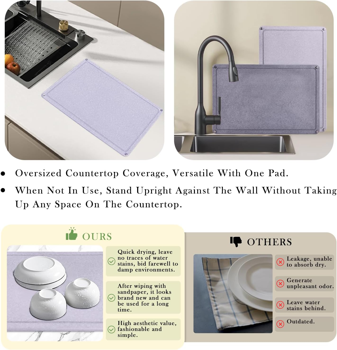 - 【 Quick Drying & Super Absorbent 】This kitchen drying mat is different from traditional silicone or fiber mats,this diatomaceous earth dish drying mat features a porous structure that instantly absorbs moisture, keeping your countertop dry and tidy. Its quick-drying properties make it perfect for daily use