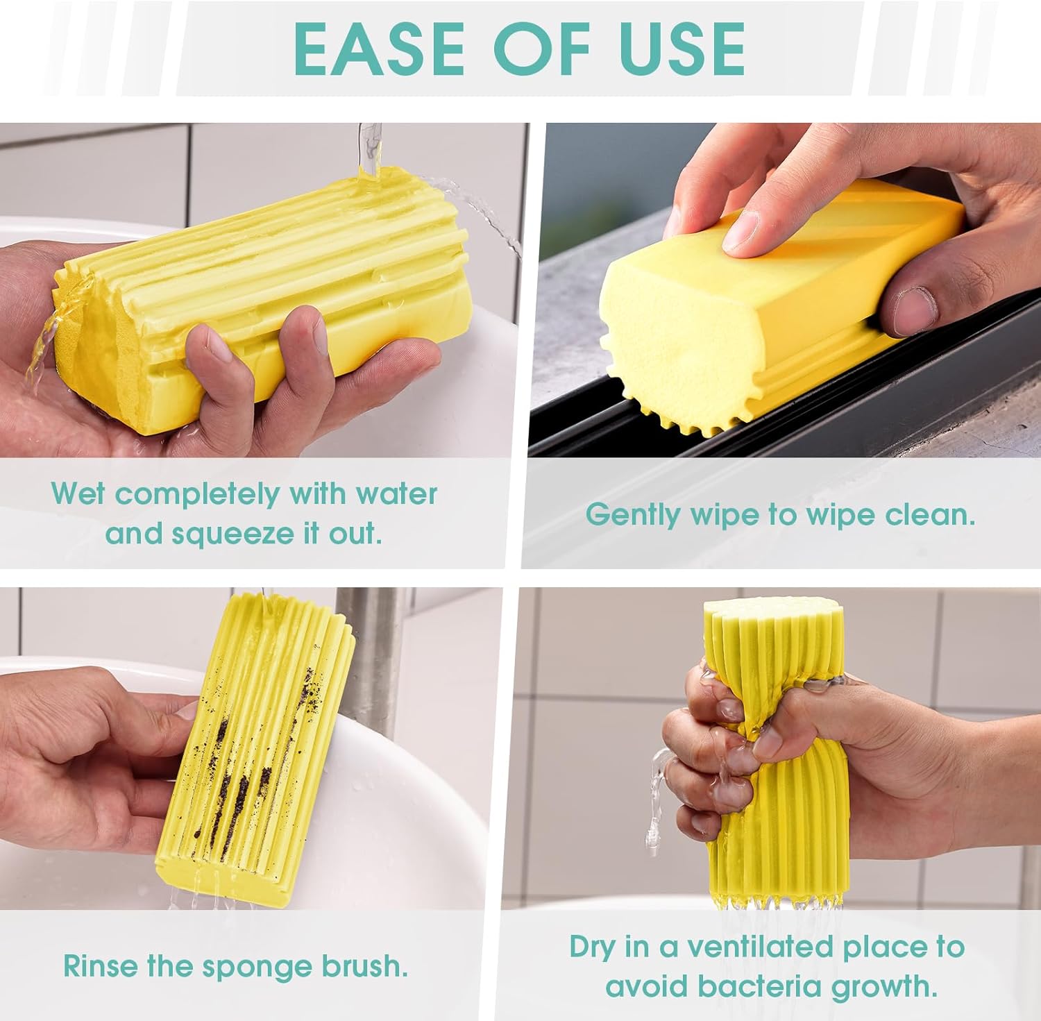 - Multi-purpose: This sponge is ideal for cleaning blinds, baseboards, taps, window track recesses, railings, mirrors, hair, glass, and ceiling fan blades.