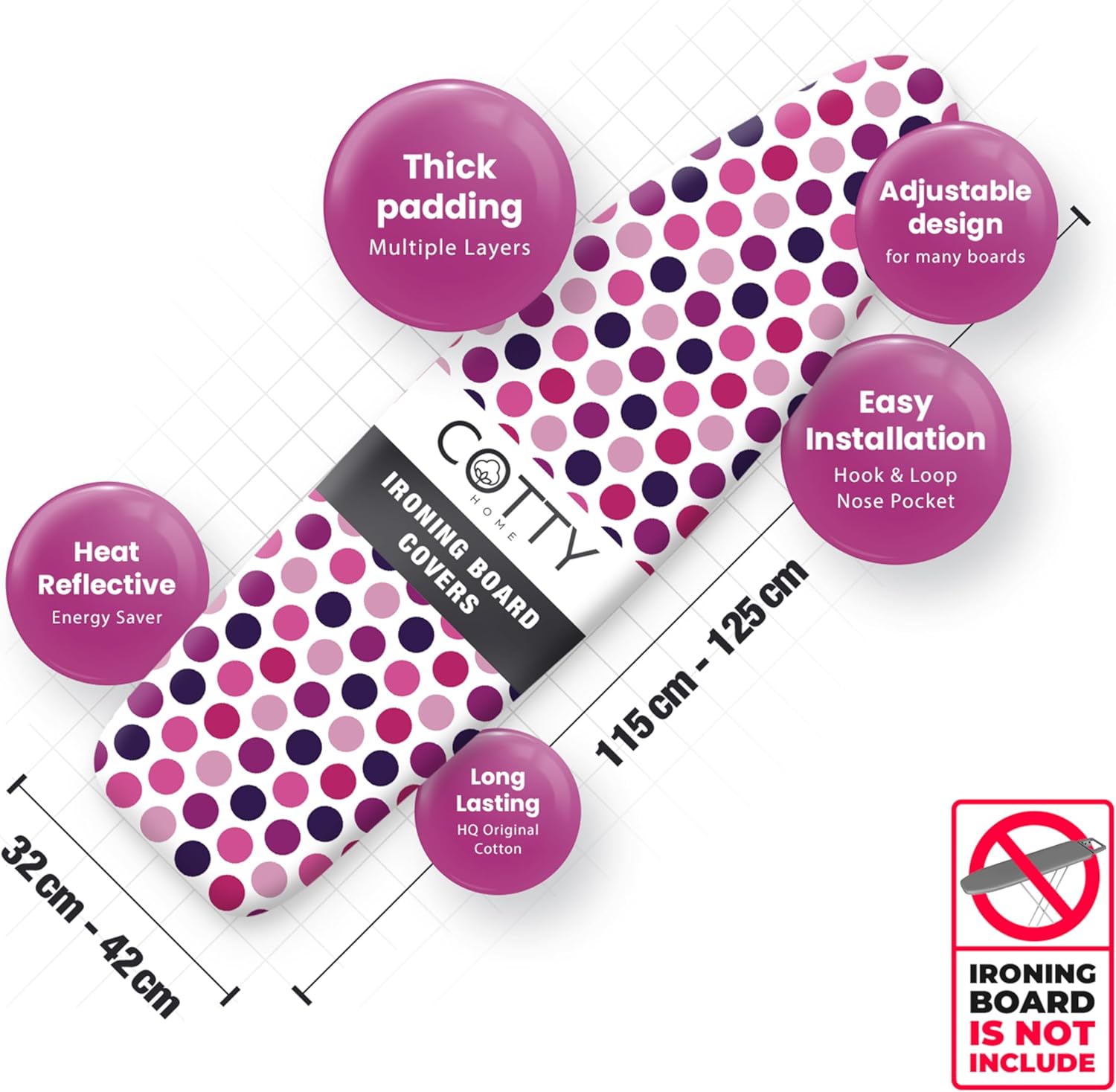 Extra Thick Ironing Board Covers with Pad Standard Size 15x54, Snug Fit Adjustable Drawstring Tightening with Stopper, Heat Reflective Coating, Nose Pocket and Fastener Straps, Polka Dots