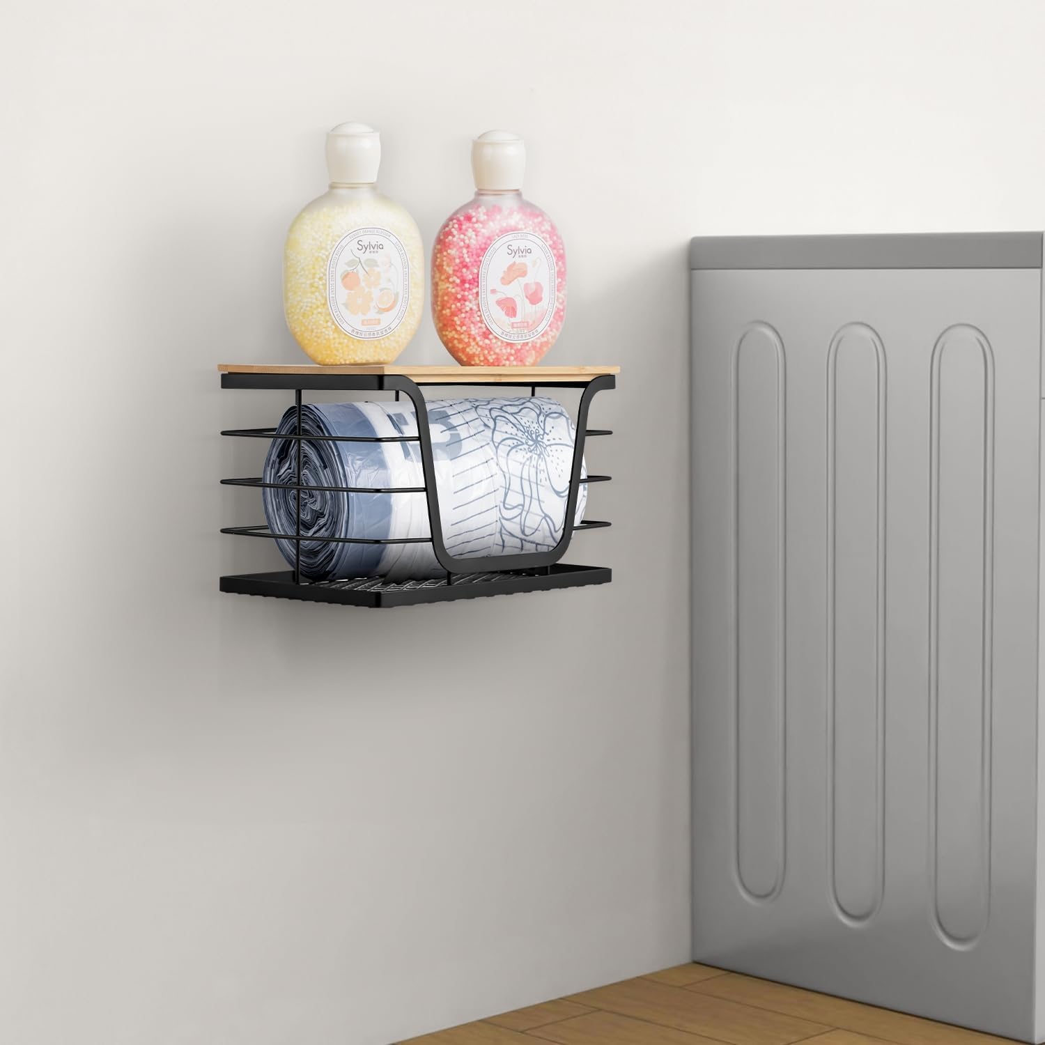 Wetheny Trash Bag Holder with Bamboo Top and Mesh Bottom, Stackable Garbage Bag Holder Dispenser Under Sink, Wall Mounted Storage for Kitchen Laundry Organizers, Black