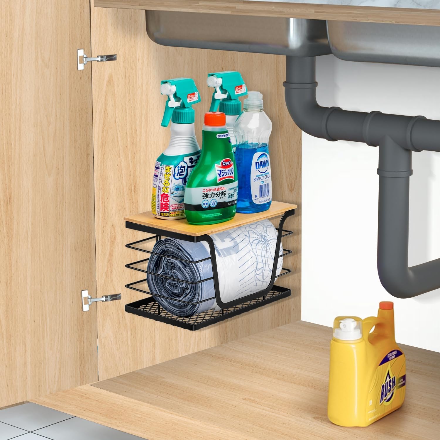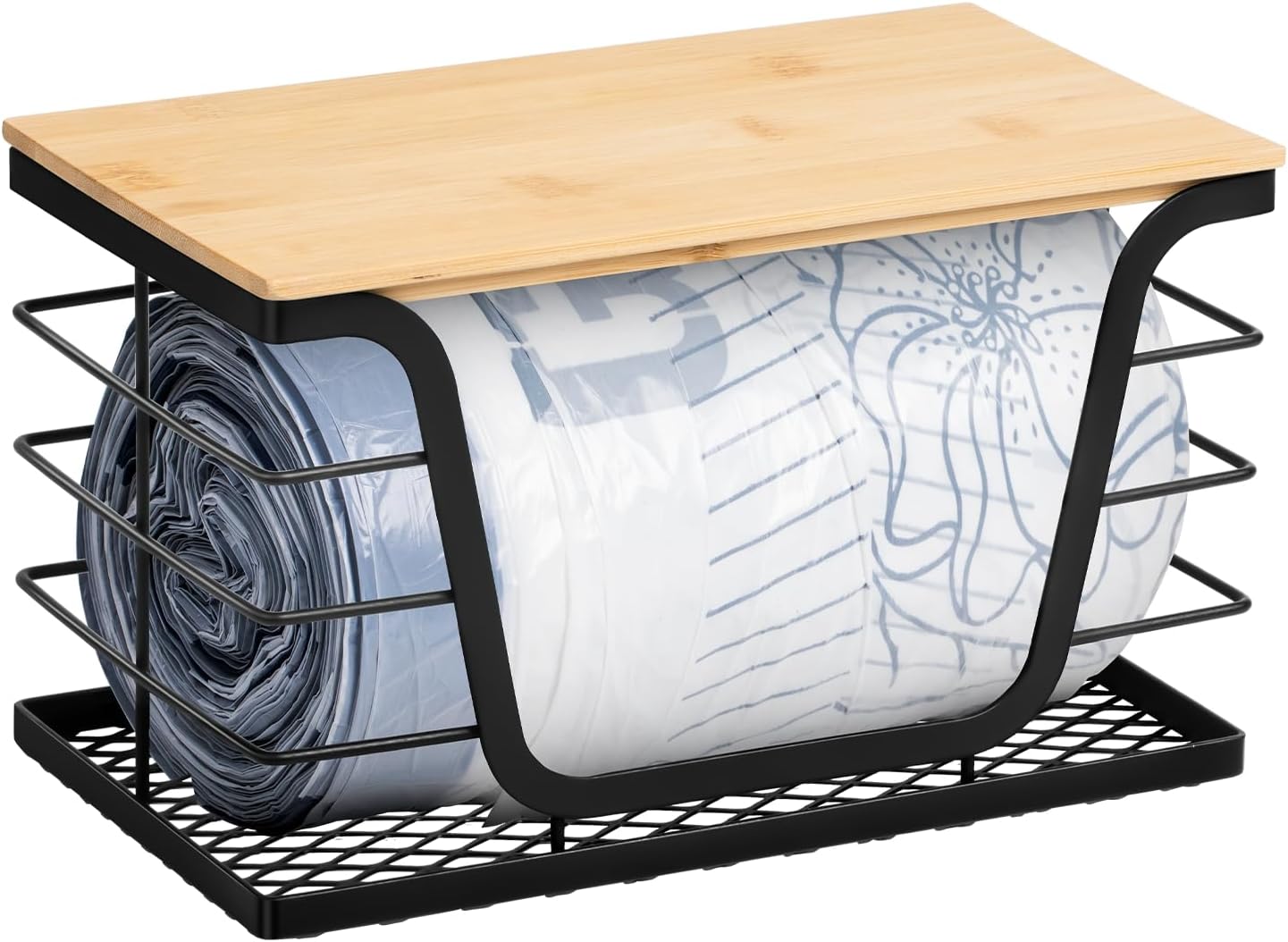 - 【Sturdy & Practical】This is a sturdy & practical garbage bag holder dispenser that stores garbage bags and other miscellaneous items. The large opening space on the front for easy access, The bamboo board top efficiently use the vertical space, it fits on the counter top, under the sink and in cabinets for creating more storage space.