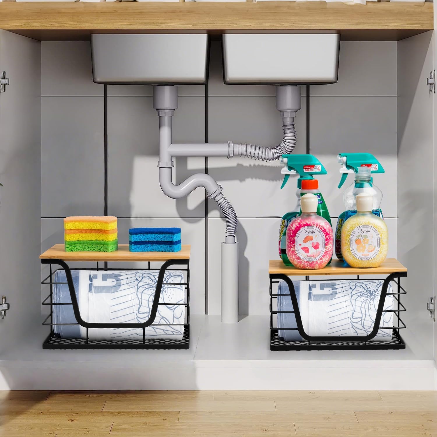 - 【 Multi-Purpose Basket】The metal frame standard basket with bamboo top and mesh bottom, it is not only be used as a trash bag holder dispenser, it is also be store potatoes and onions on the pantry, also suitable for under the sink on the kitchen and bathroom, laundry room organization and storage
