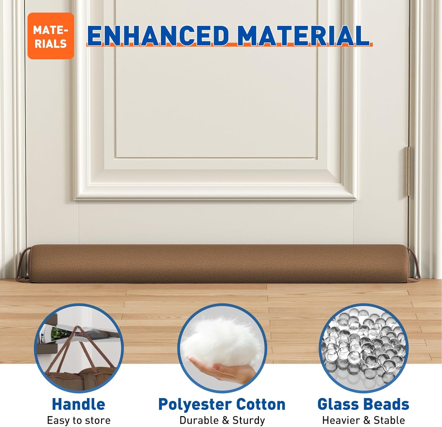 - ENHANCED MATERIAL – This under door draft stopper is made with soft cotton and filled with glass beads for added stability, improving thermal, soundproof and dustproof performance. It weighs 2.18 lbs and fits the door snugly.