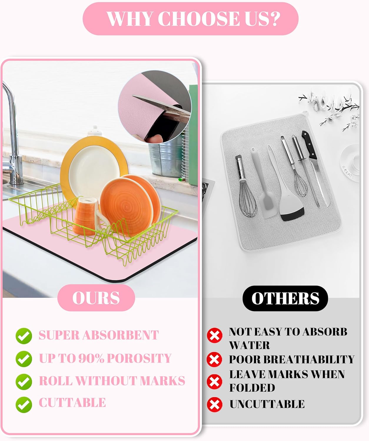 - Super Absorbent: Dish Drying Pad is made of super absorbent nano, the drying pad is soft and highly absorbent, which can dry quickly. In addition, the drying mat is thick enough to better protect countertops, tableware, and glassware from damage and contamination.
