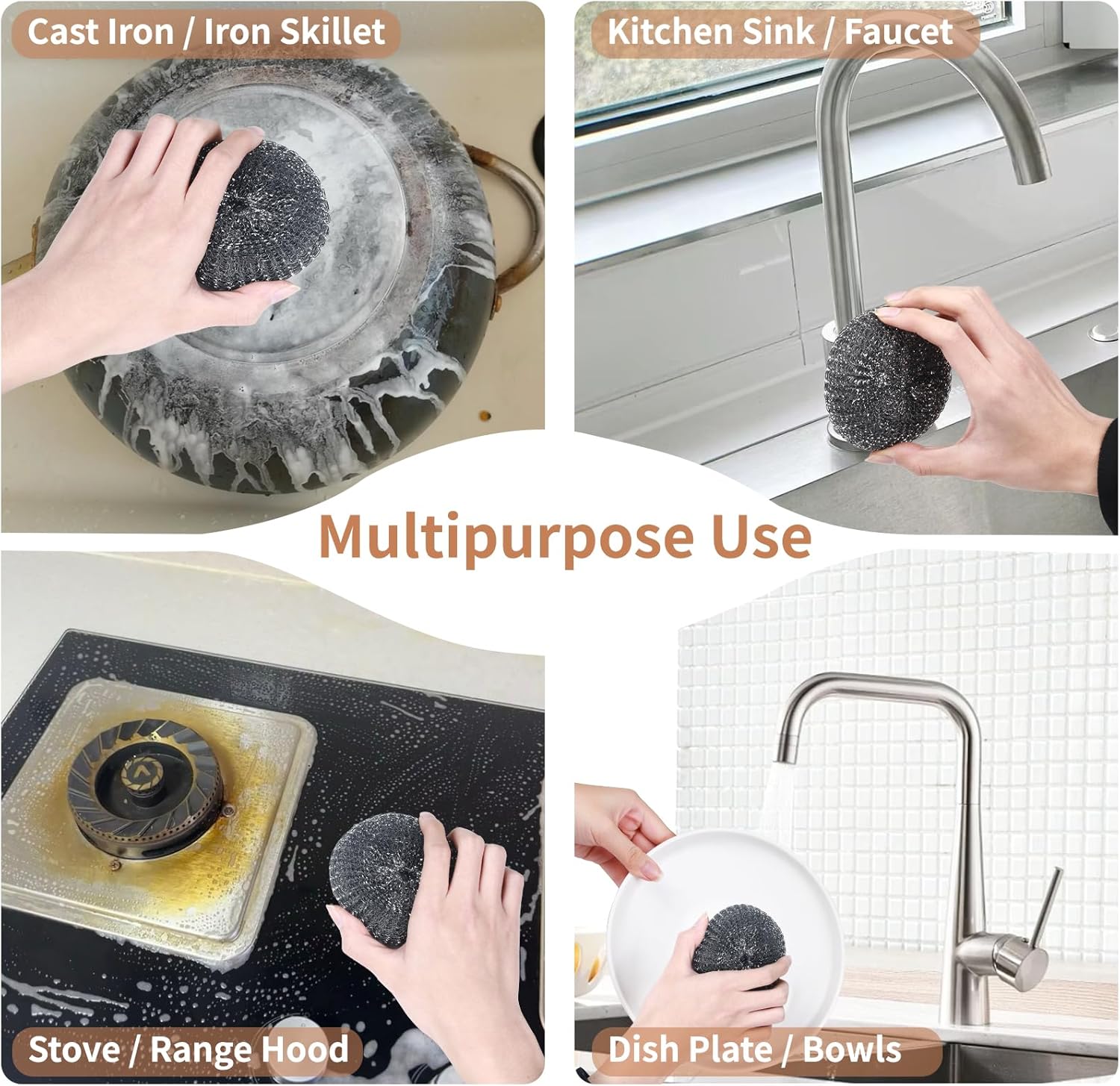 - [ Wide Application ] Our cleaning pads scrubber, perfect for use in the kitchen, bathroom or outdoors. This versatile tool is designed to clean pots, pans, cast iron, utensils, bowls, sinks, range hoods, faucets. Made from durable stainless steel, this scrub brush is a reliable assistant for tackling tough stains and grease effortlessly