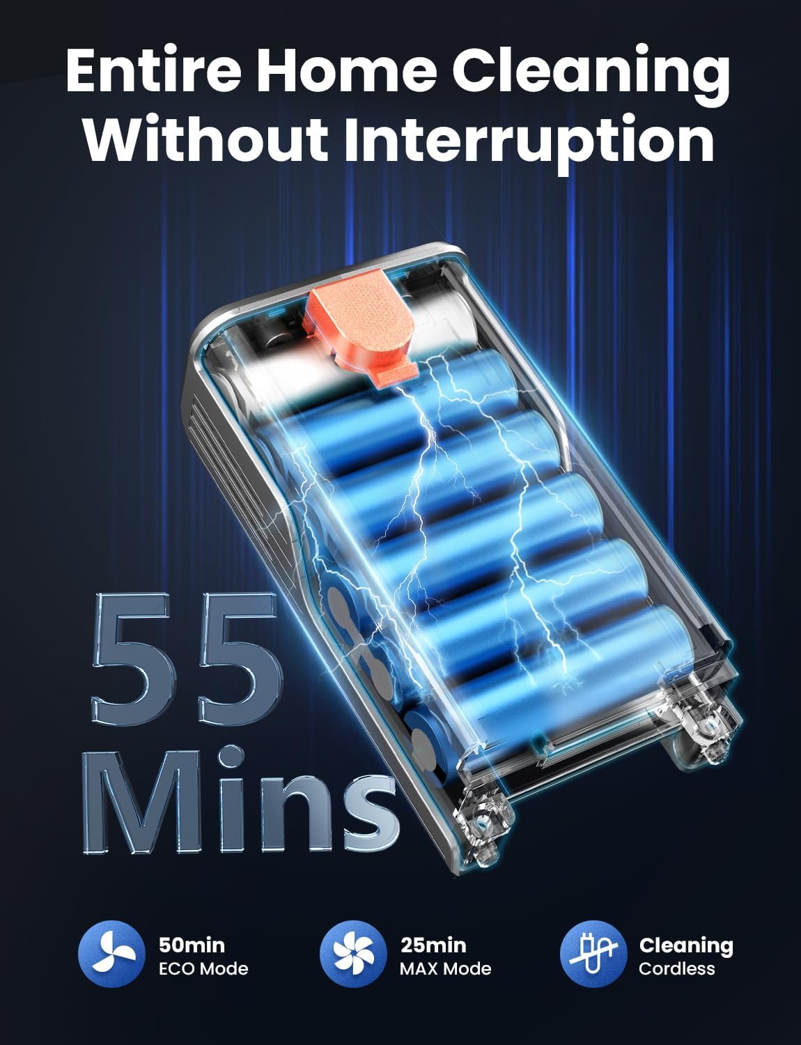 - ๐ฑ5๐ ๐ถ๐ป๐ ๐ฅ๐๐ป๐๐ถ๐บ๐ฒ ๐๐ถ๐๐ต ๐ฅ๐ฒ๐บ๐ผ๐๐ฎ๐ฏ๐น๐ฒ ๐๐ฎ๐๐๐ฒ๐ฟ๐: S2 cordless vacuum includes a 6x2500mAh detachable battery that provides up to 55 minutes of cleaning on Eco Mode, and 25 minutes on Max Mode. Easily swap batteries and recharge for extended use without interruption.