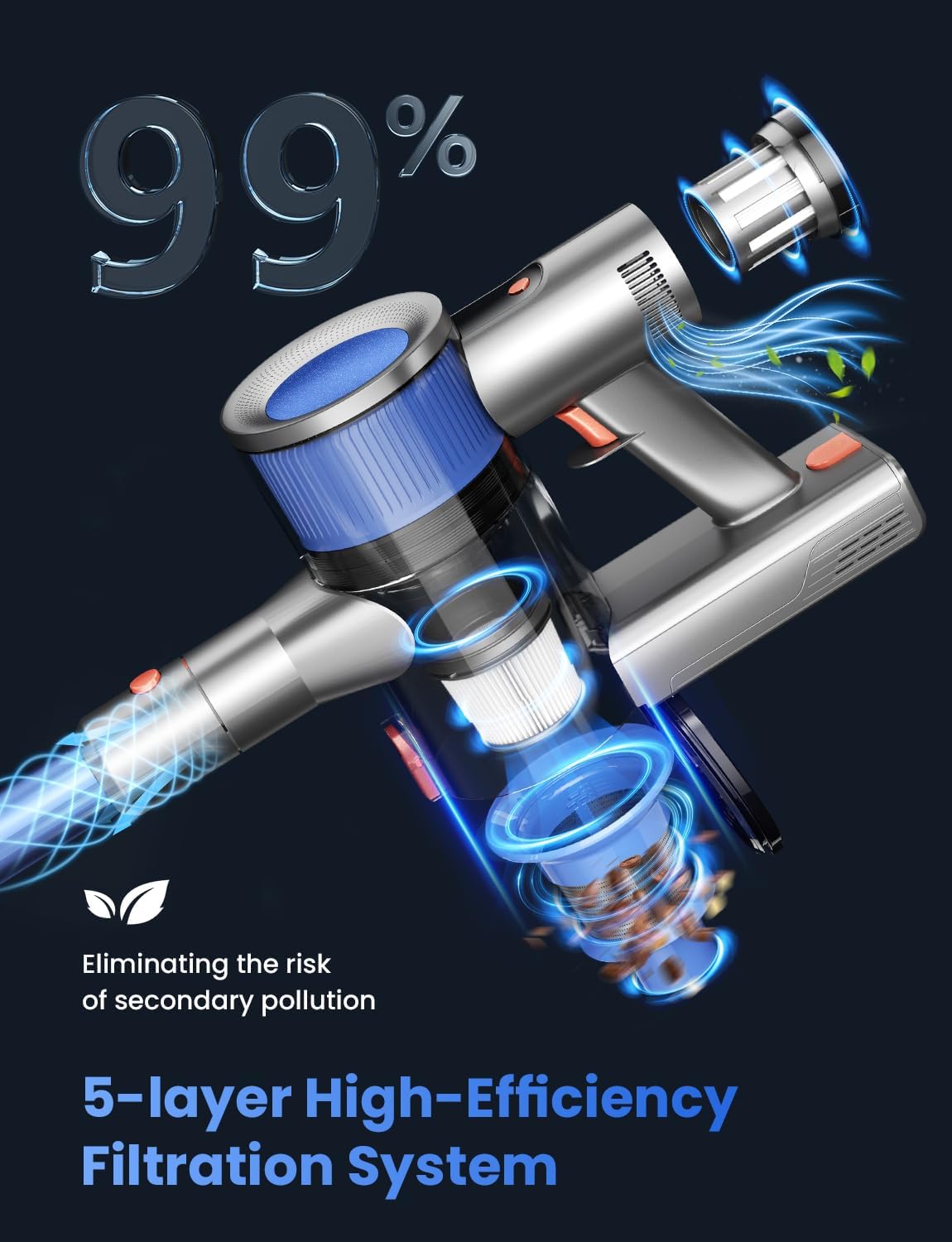 - ๐ฑ0๐๐ฃ๐ฎ ๐ฃ๐ผ๐๐ฒ๐ฟ๐ณ๐๐น ๐ฆ๐๐ฐ๐๐ถ๐ผ๐ป ๐ณ๐ผ๐ฟ ๐๐ฒ๐ฒ๐ฝ ๐๐น๐ฒ๐ฎ๐ป๐ถ๐ป๐ด: Tackle dirt, dust, and pet hair with ease using the 350W brushless motor that delivers up to 50,000Pa of suction. This cordless stick vacuum cleaner works great on hardwood floors, carpets, tile, and moreโperfect for whole-home cleaning.