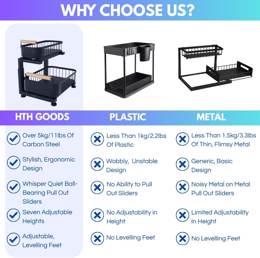 - [Heavy-Duty Premium Build] - Constructed from sleek yet durable carbon steel, our under sink organizer boasts a frame three times as thick and heavy as standard models, weighing just over 5KG(11Ibs), ensuring unparalleled strength and longevity. Ideal for organizing drawers in any storage cabinet or enhancing your bathroom decor.