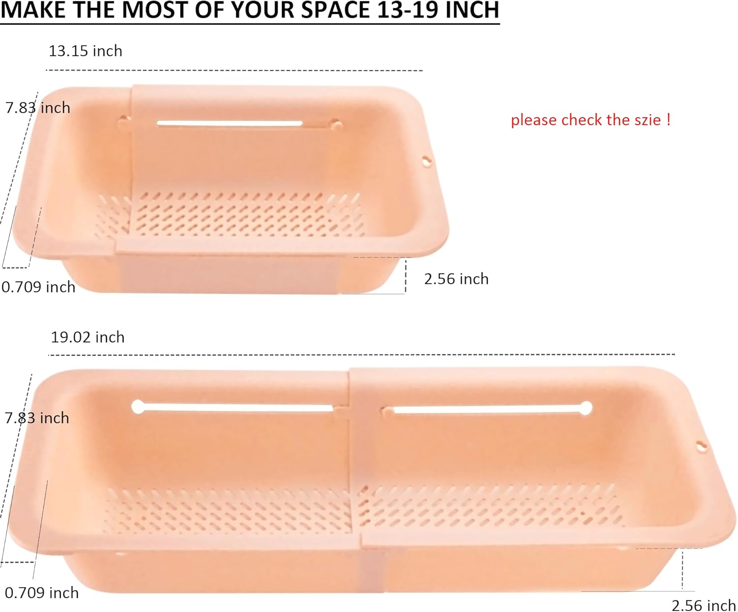 - LASSHSWA Over the sink extendable strainer, SIZE: 13-19 in (smaller space-saving design) . Stainless steel drain strainer, SIZE: Outer diameter: 4.5β; inner filter: 3β; depth: 1β . They fit for most kitchen sinks and drains.