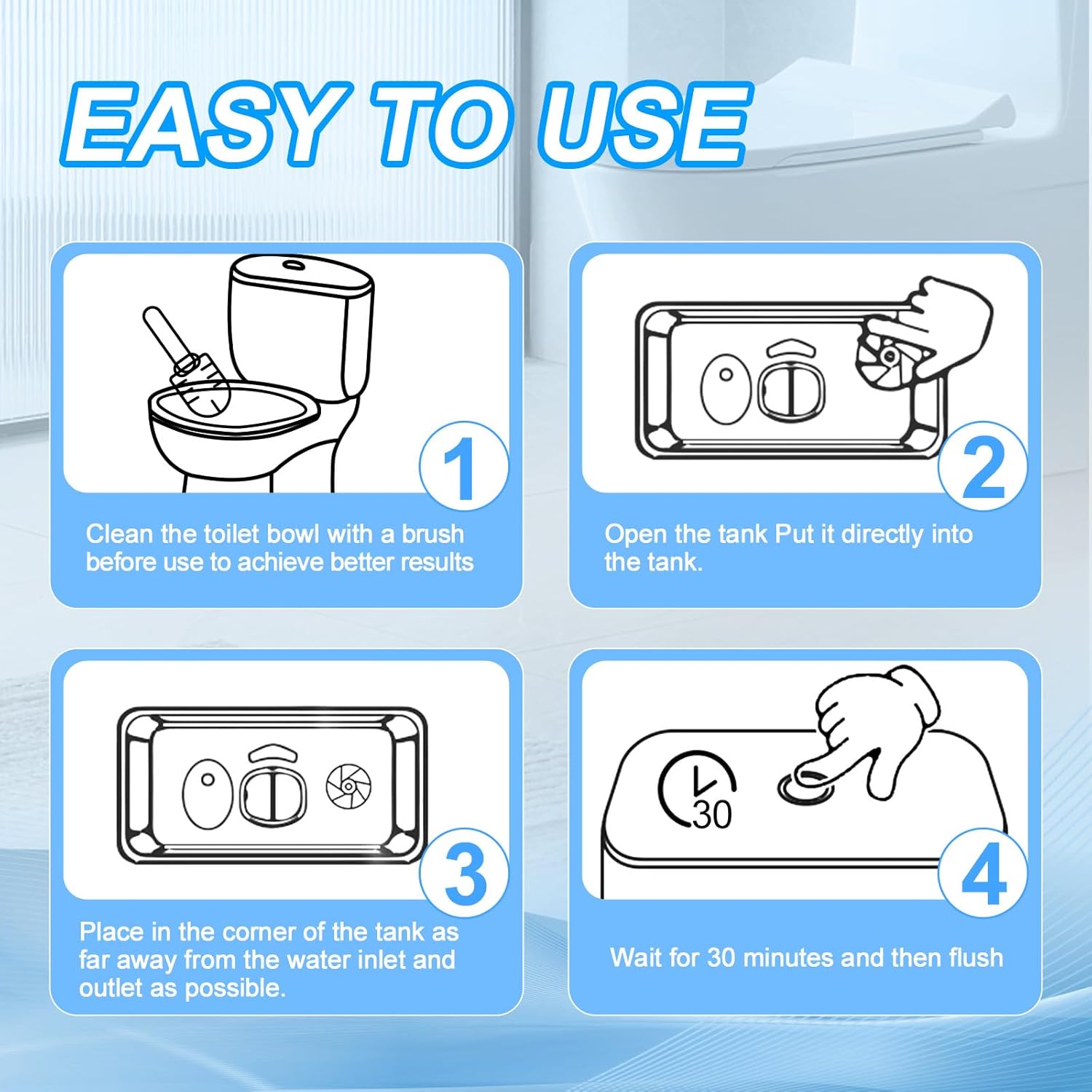 - EFFORTLESS "DROP & FORGET" CLEANING: Simply drop 1 tablet into the tank—it works automatically with every flush. Reduce the frequency of scrubbing, wiping, or manual cleaning required! Long term use can reduce scale deposition in hard water areas, keep the toilet glaze smooth, and reduce the difficulty of subsequent deep cleaning. Perfect for renters, vacation homes, or anyone seeking a hands-free solution.