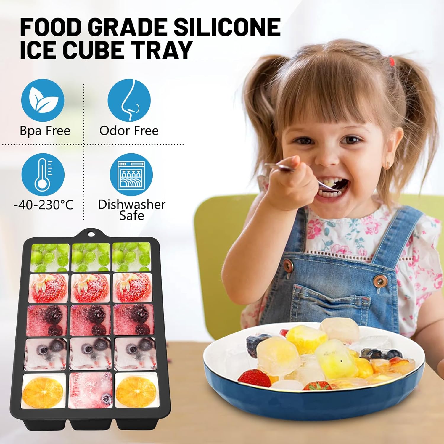 - Silicone Ice Cube Tray; Made of food grade silicone which is safe, soft and odorless, they can directly contact food. they can withstand long-term low-temperature storage and high-temperature heating, can be used in refrigerator, freezer and microwave, oven