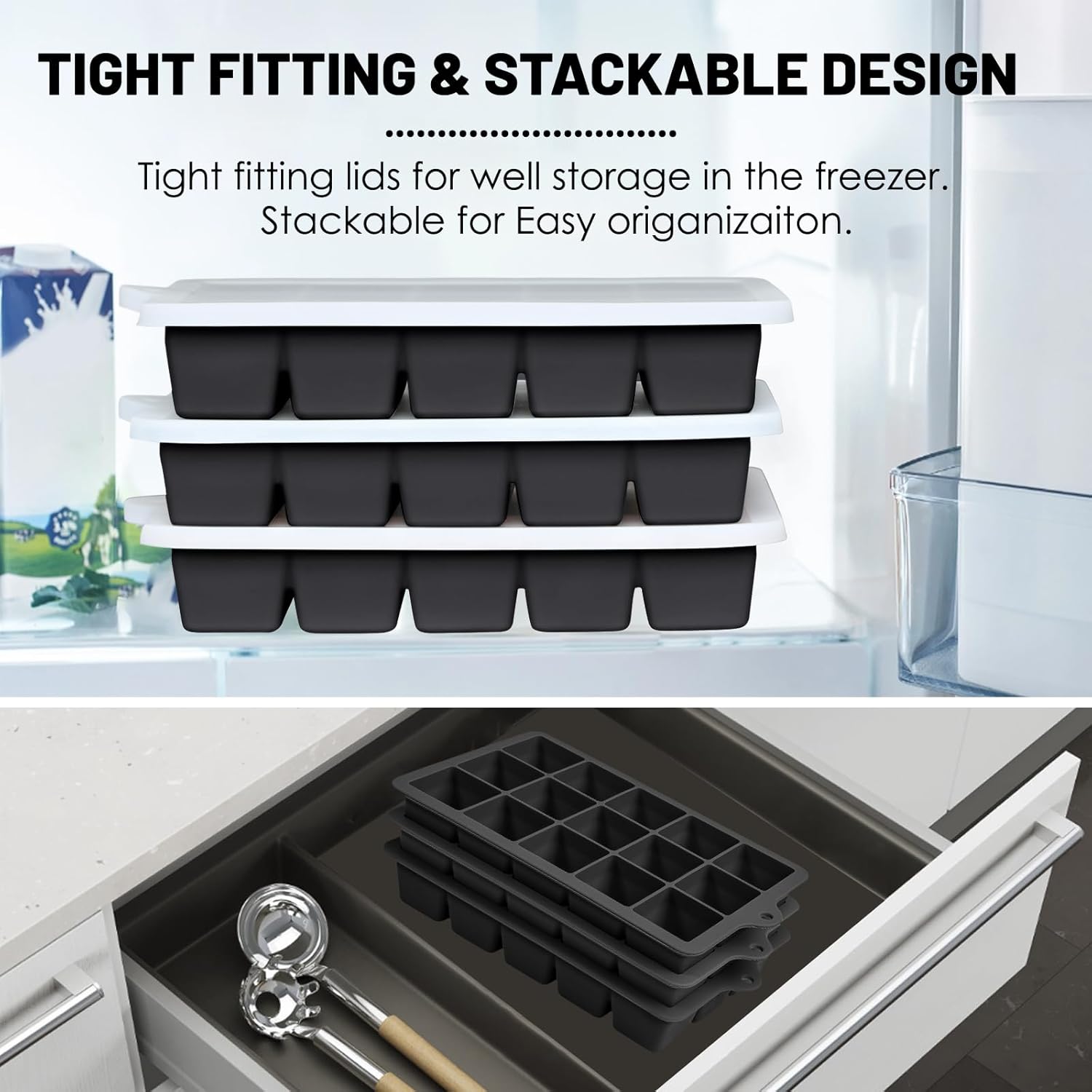 - Ice Cube Molds with Lid; covered with silicone lid, prevents ice cube/food from absorbing the fridge odor, you can get fresh and clean food or ice. These whiskey ice maker with lid can be easily stacked and will make the freezer neat and spacious