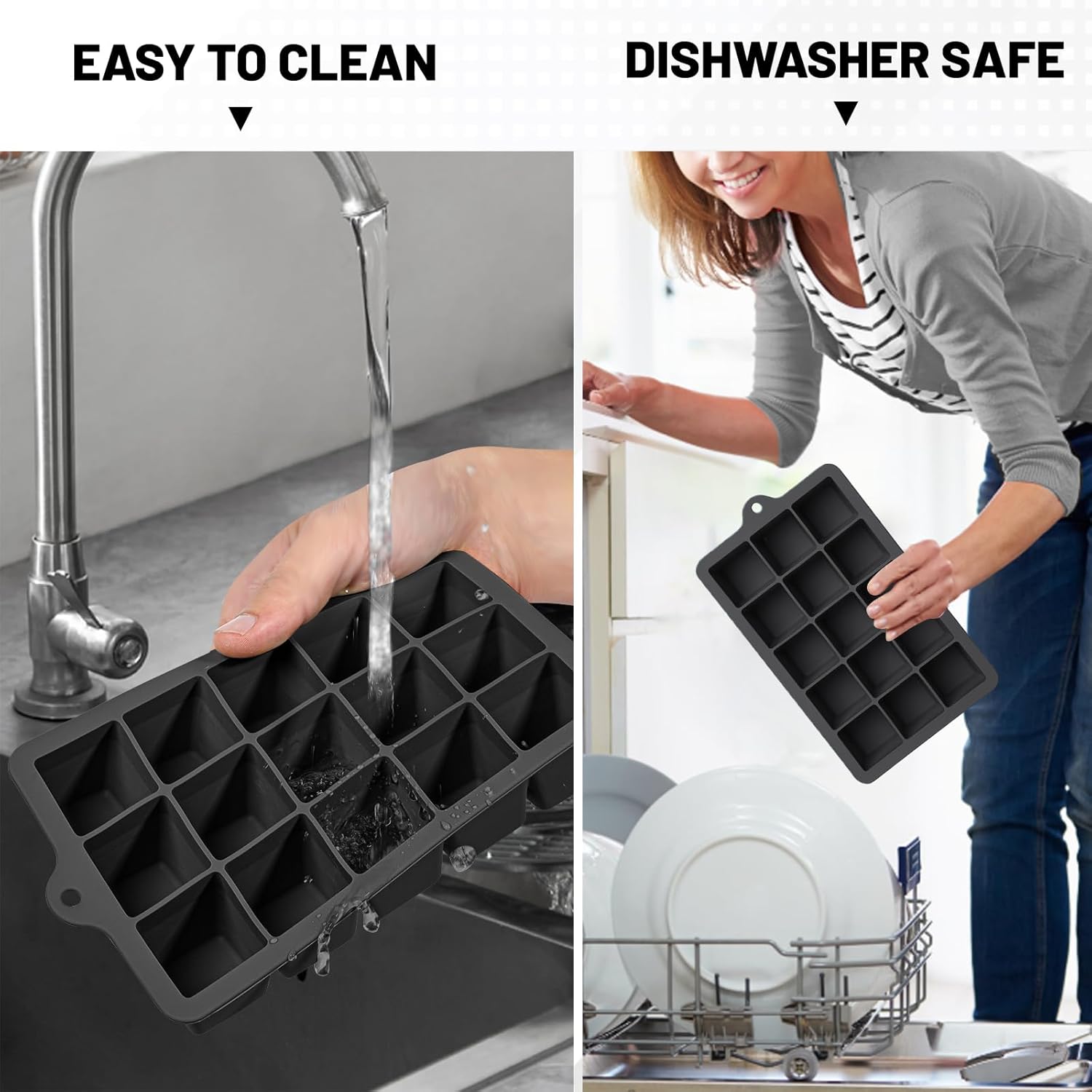 - Easy Release Ice Cube Tray; Soft silicone material and independent cavity design make it easy to release ice, you can push from the bottom to remove ice cubes for whiskey. Square ice cube trays has a non-sticky flexible surface, it is very easy to clean, dishwasher safe
