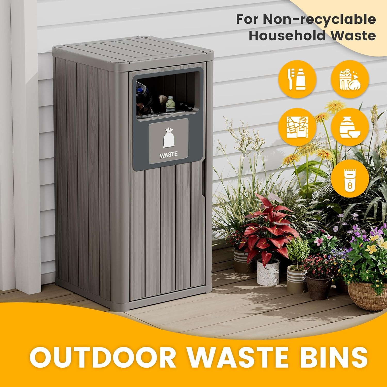- Waterproof Material - The outdoor garbage can is made of stable and recyclable resin material that is waterproof and fade resistant. The panels are sturdy and will not bend, warp or break easily and are highly weather resistant