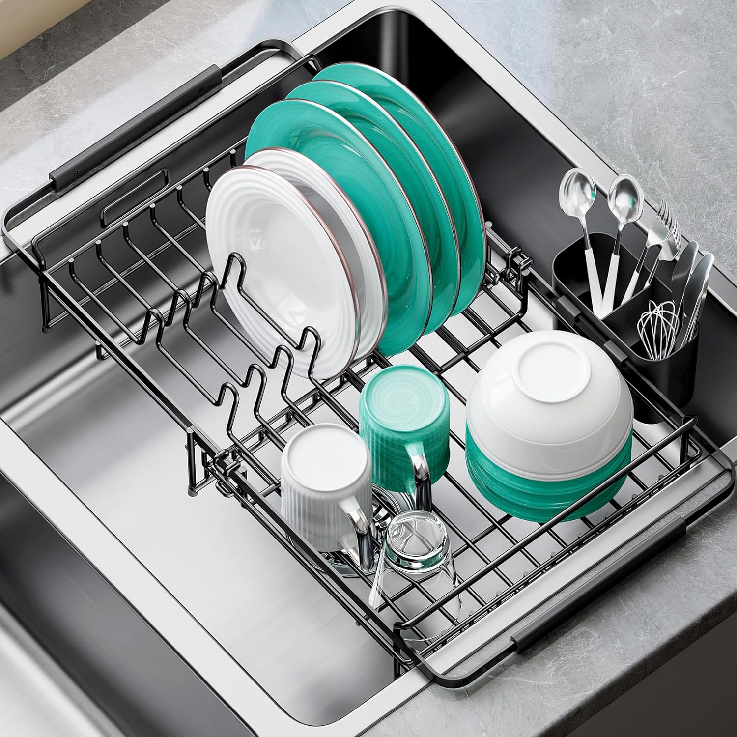 Dish Drying Rack in Sink - Expandable (14.5''-18''L) Over The Sink Dish Rack with Utensil Holder, Space-Saving Dish Drainer for Kitchen Counter, 1 Piece, Matte Black