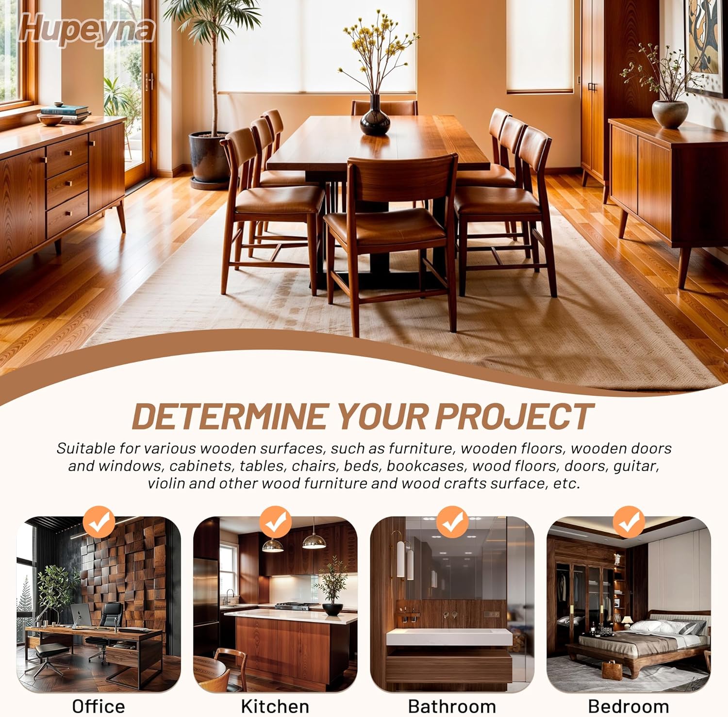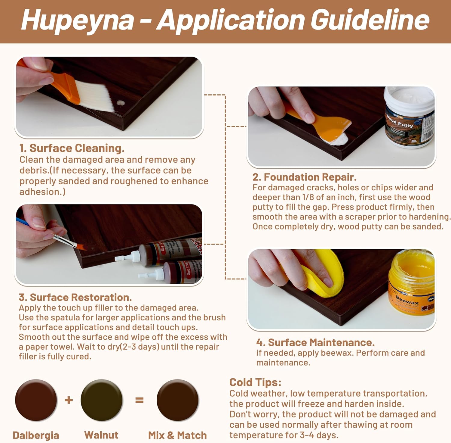 - Fully functional wood repair kit for wood furniture. Deep Repair (Hupeyna Wood Putty) Premium wood filler putty seamlessly fills deep scratches, dents and holes in wood furniture and flooring. Surface Coloring (Repair Wood Filler) Hupeyna Newly upgraded 5 colors to choose: white/black/dalbergia/walnut/black walnut. Care and Maintenance (Wood Furniture Polish) Beewax Wood Furniture Polish can be used on both finished and unfinished wood surfaces.