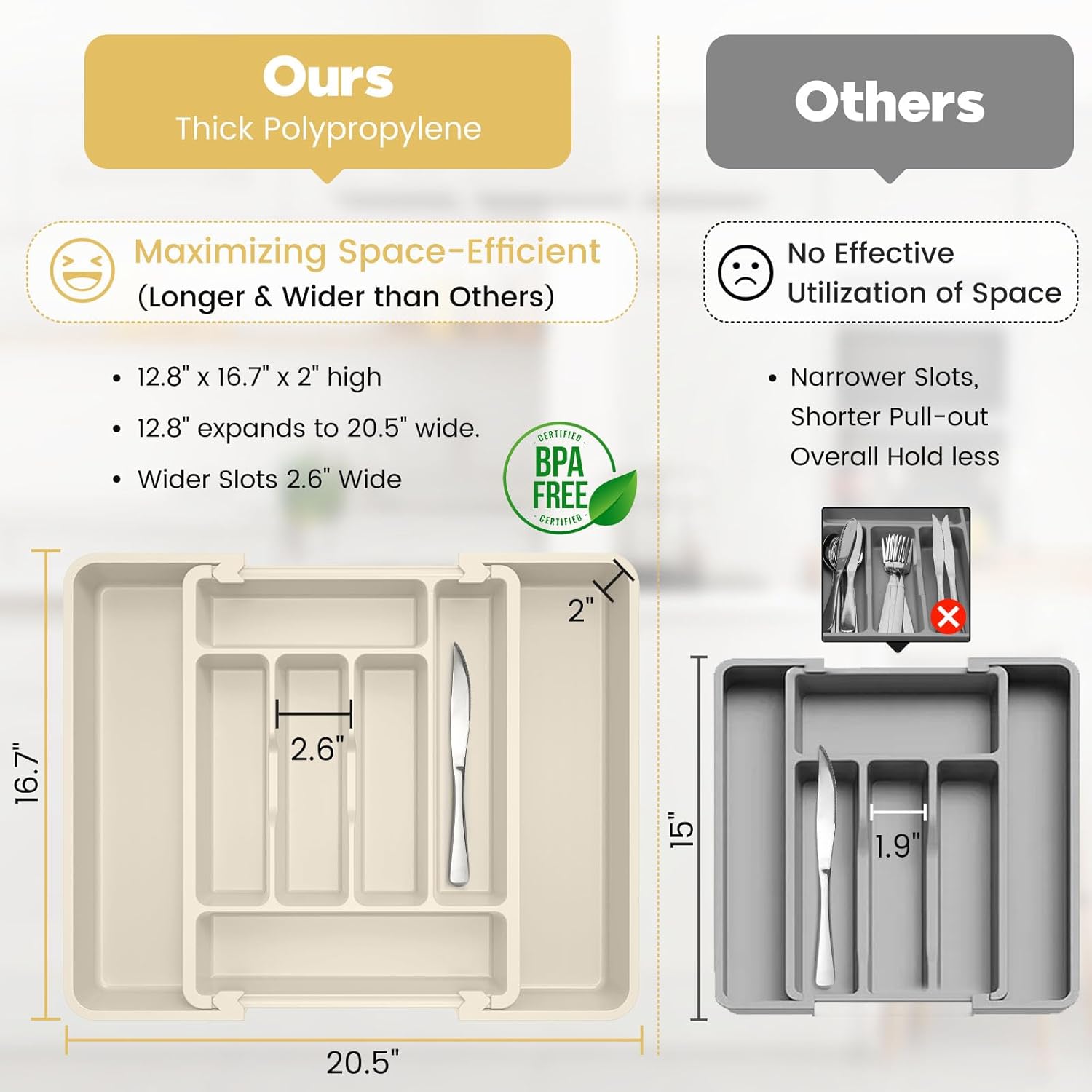 Caperci Large Silverware Organizer for Kitchen Drawer & Utensils - Expandable Drawer Organizer for Cutlery, Flatware & Gadget, BPA-Free Thick Plastic, Wider Compartments & Non-skid Feet (Tofu)