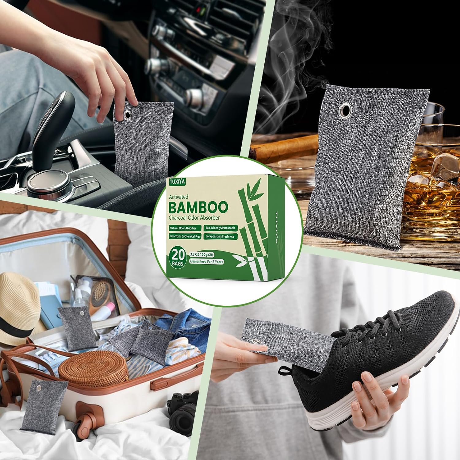 - 【Activated Charcoal】:This set includes 20 charcoal deodorizer bags (100g each) with hooks, designed to naturally absorb odors and moisture for a fresher environment.