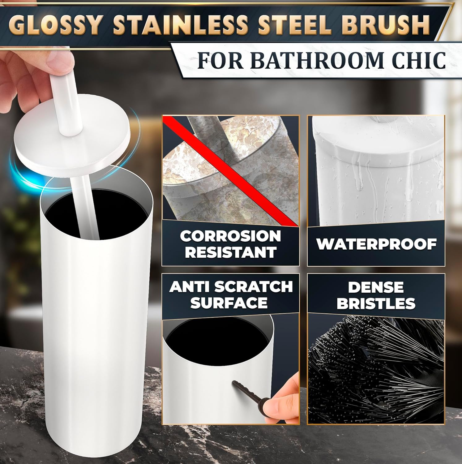 - White-Compatible Design: Our white toilet brush and holder set is crafted from a white-coated stainless steel. This white toilet bowl brush and holder perfectly complements white-toned bathroom