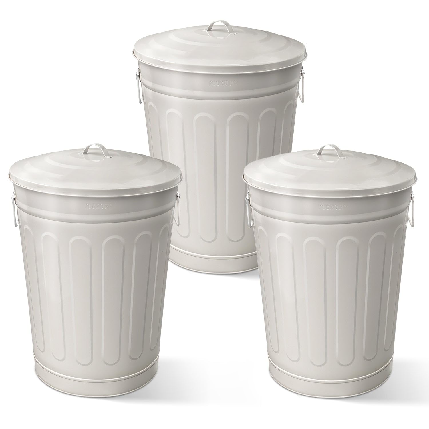 Plexon Round Trash Can 13 Gallon, Vintage Metal Outdoor Trash Can with Lid, Retro Farmhouse Garbage Container, Old School Modern Ash Bucket, Beige 3 Pack