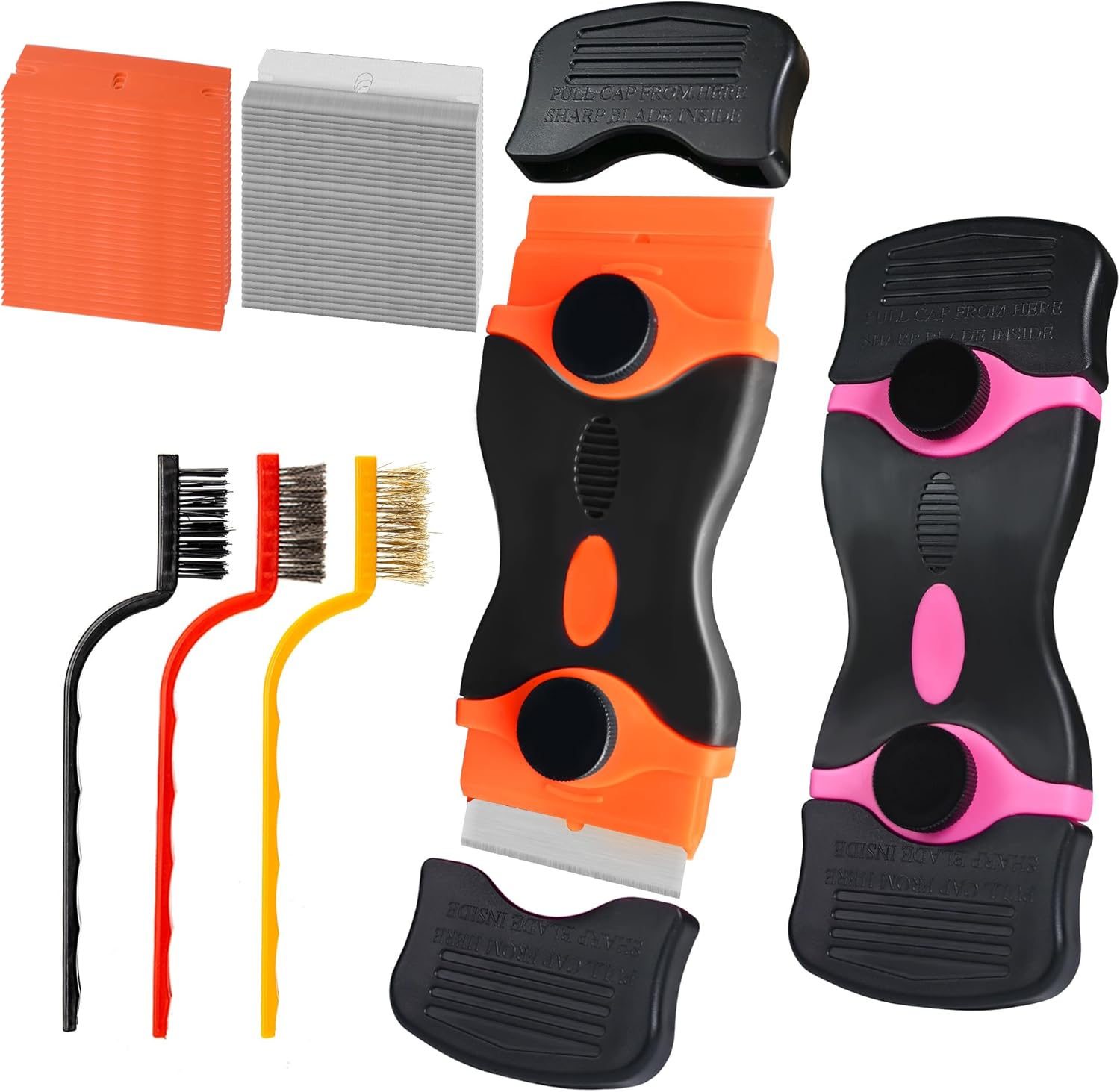 Razor Blade Scraper Tool,2 Pack Razor Scrapers with Extra 50Pcs Blades and 3pcs Wire Brushes Set,Glass Top Stove Scraper,Scraper Tool,Paint Scraper,Glass Scraper,Cleaning Tools for Oven, Cooktop