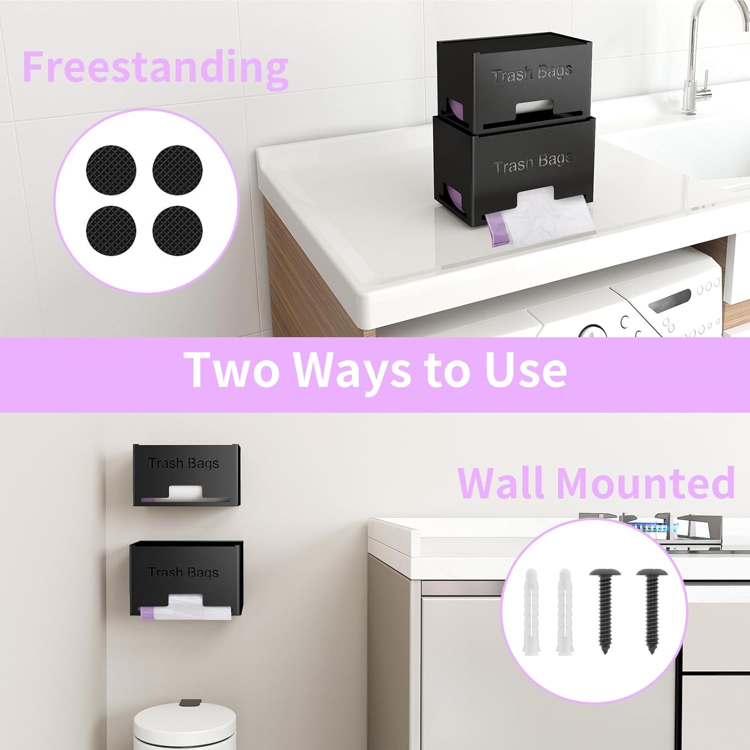 - 【2 Ways to Use】: These 2 pack trash bag holder can be stacked together to increase storage space, and fixed well when stacked. Wall anchors and screws are included if you prefer to hang this to the wall above the trash can. Or you can use the included small rubber pads instead to place it freestanding on the countertop. No Assembly Required, offering double the storage convenience