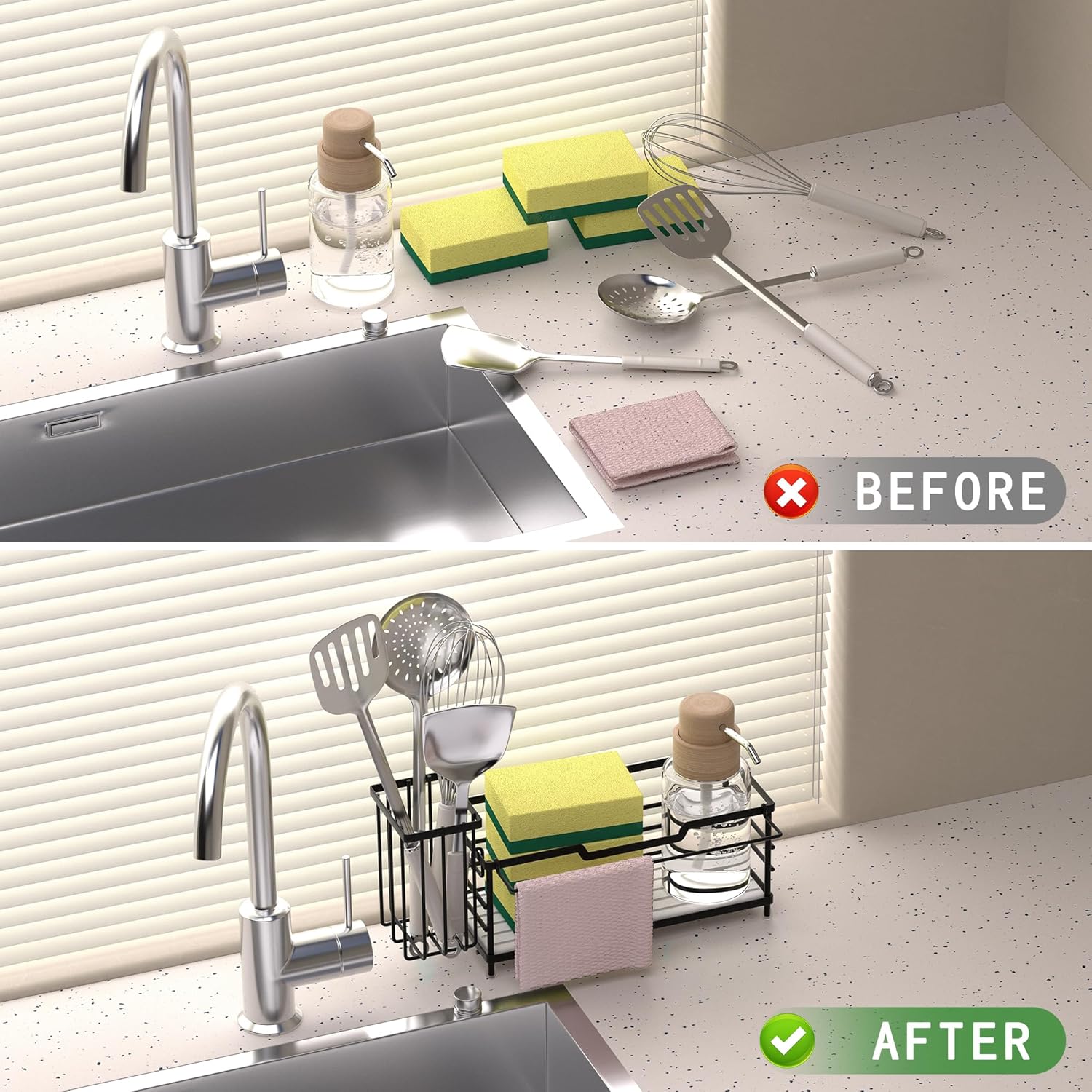 - Multi-Purpose Sink Organizer β Holds soap, sponges, scrub brushes, dish soap, and towels neatly in one place. Ideal for kitchen sink organization or bathroom counter organization.