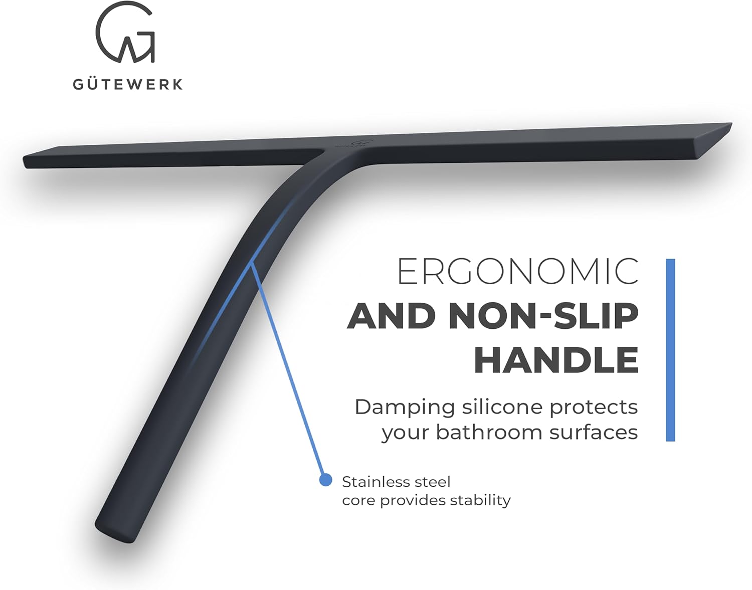 - MINIMALIST TIMELESS DESIGN - The GÜTEWERK glass squeegee is crafted with a matte black finish that impresses with its elegant timeless and smart design. In addition, the chrome-colored stainless-steel hook integrates well with any modern bathroom.