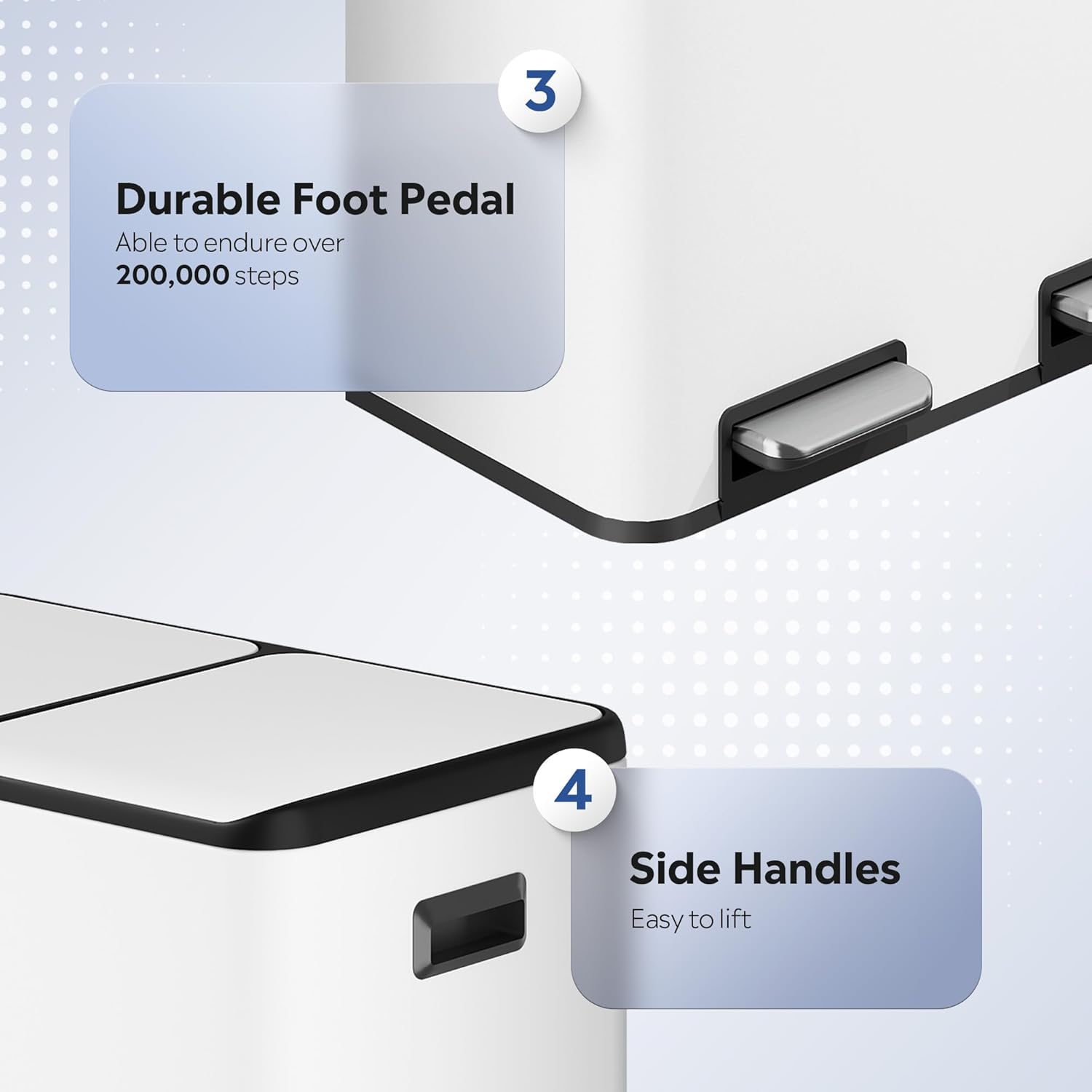 WLIVE Dual Trash Can, 2 x 8 Gallon (2 x 30 L), Step Trash Can with Lid with Inner Buckets, 2 Compartment, Heavy-Duty Stainless Steel Gabage Can for Kitchen with 15 Trash Bags, White