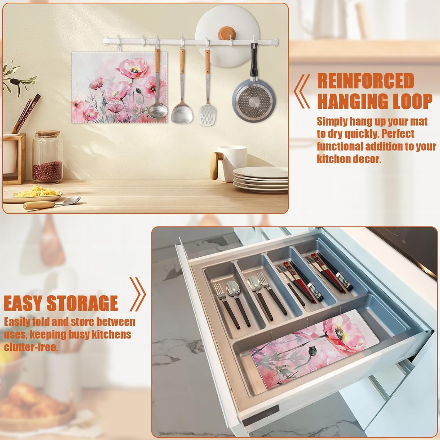 Pink Poppy Flower Dish Drying Mat for Kitchen Counter Microfiber Absorbent Dish Kitchen Drying Mat Draining Reusable Washable for Dishes/Utensils/Counterto