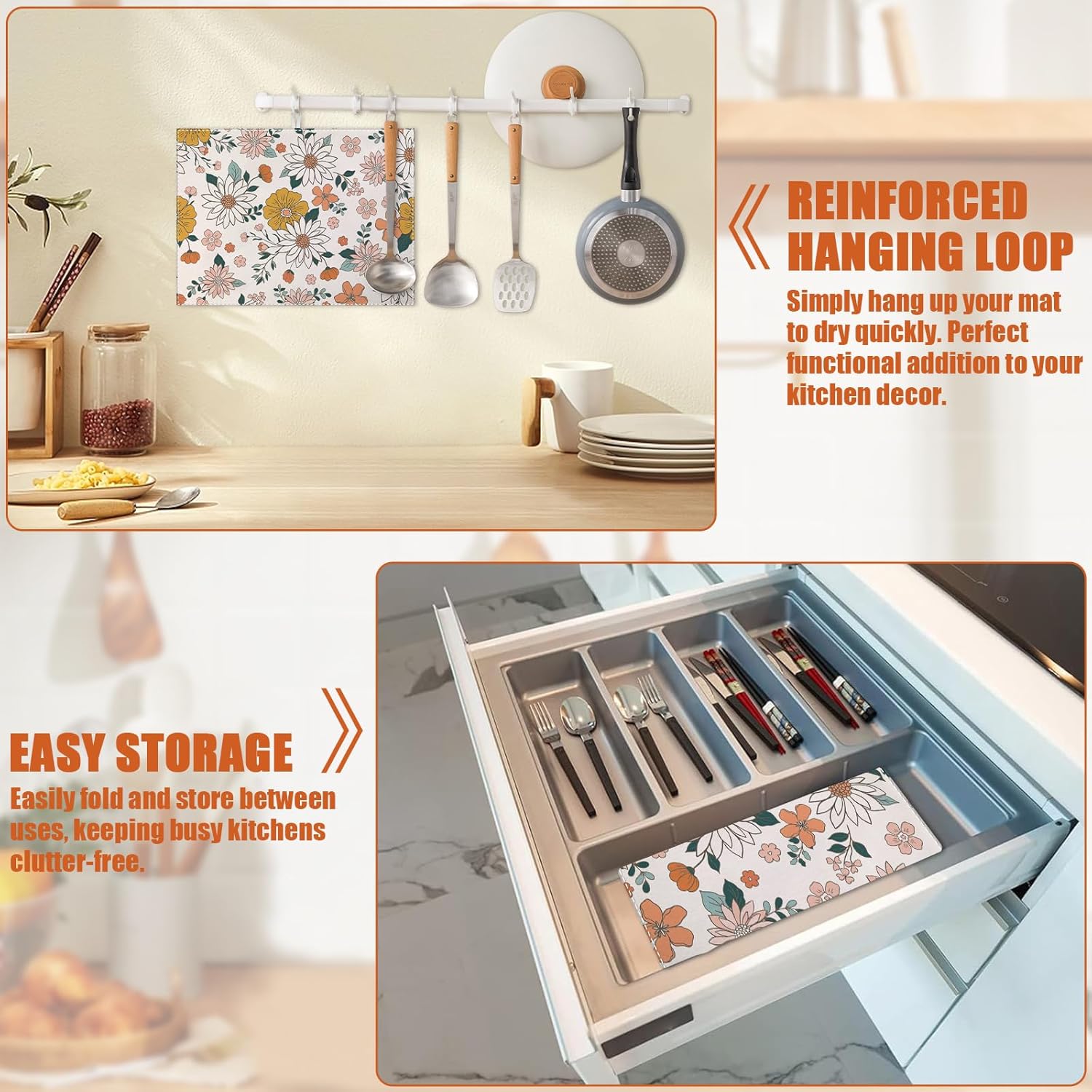 Boho Flower Dish Drying Mat for Kitchen Counter Microfiber Absorbent Dish Kitchen Drying Mat Draining Reusable Washable for Dishes/Utensils/Counterto