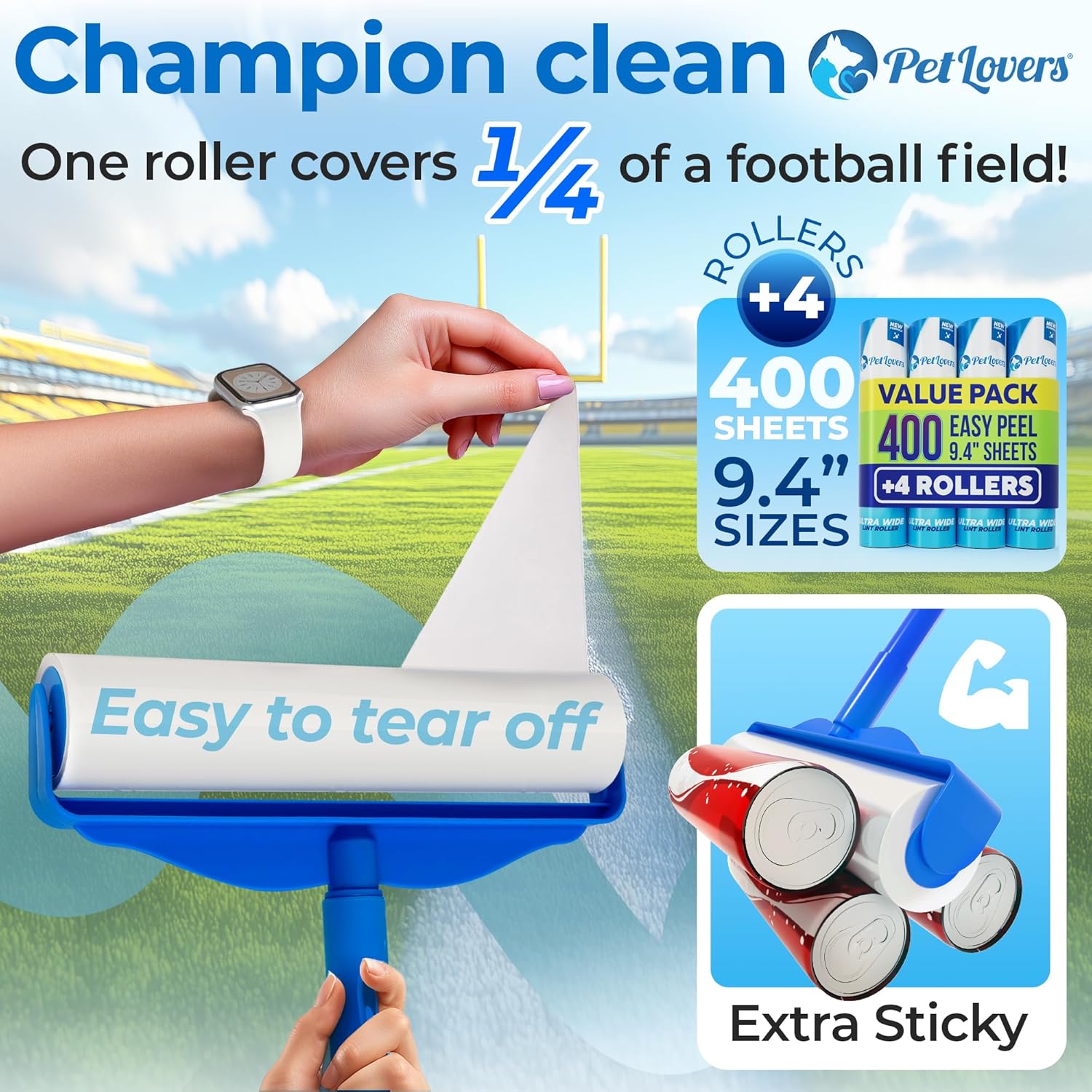 PetLovers Large Lint Roller with 3 Refills – 400 Total Sheets for Tackling Pet Hair, Extra Large Floor and Carpet Roller for Homes with Pets, Perfect for Floors, Furniture, and Loving Pet Owners