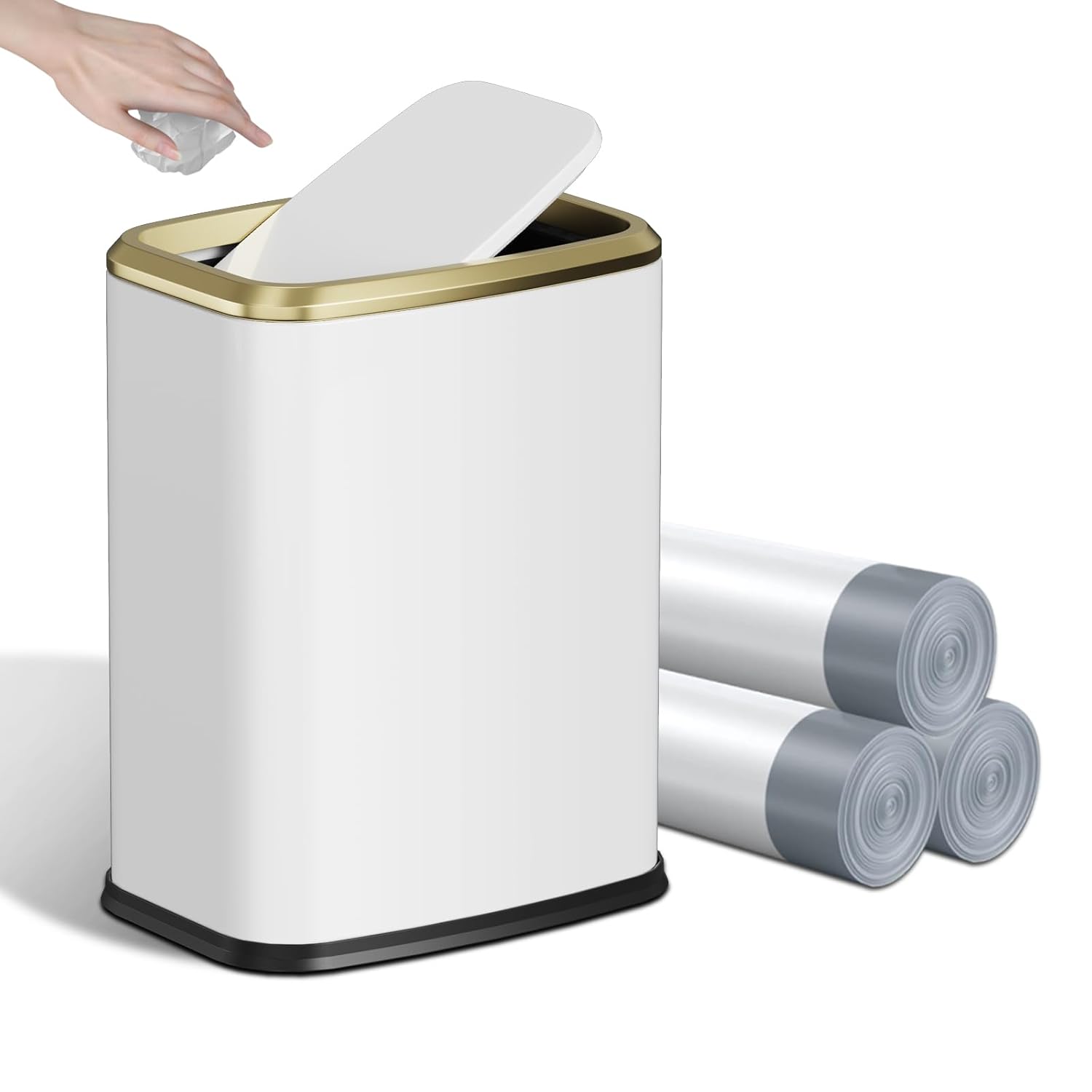 8L/2.1 Gallon Small Bathroom Trash Can with Lid, Swing-Top Rectangular Waste Bin, Stainless Steel Garbage Can for Home, Office, Toilet, Bedroom, Living-Room (White)