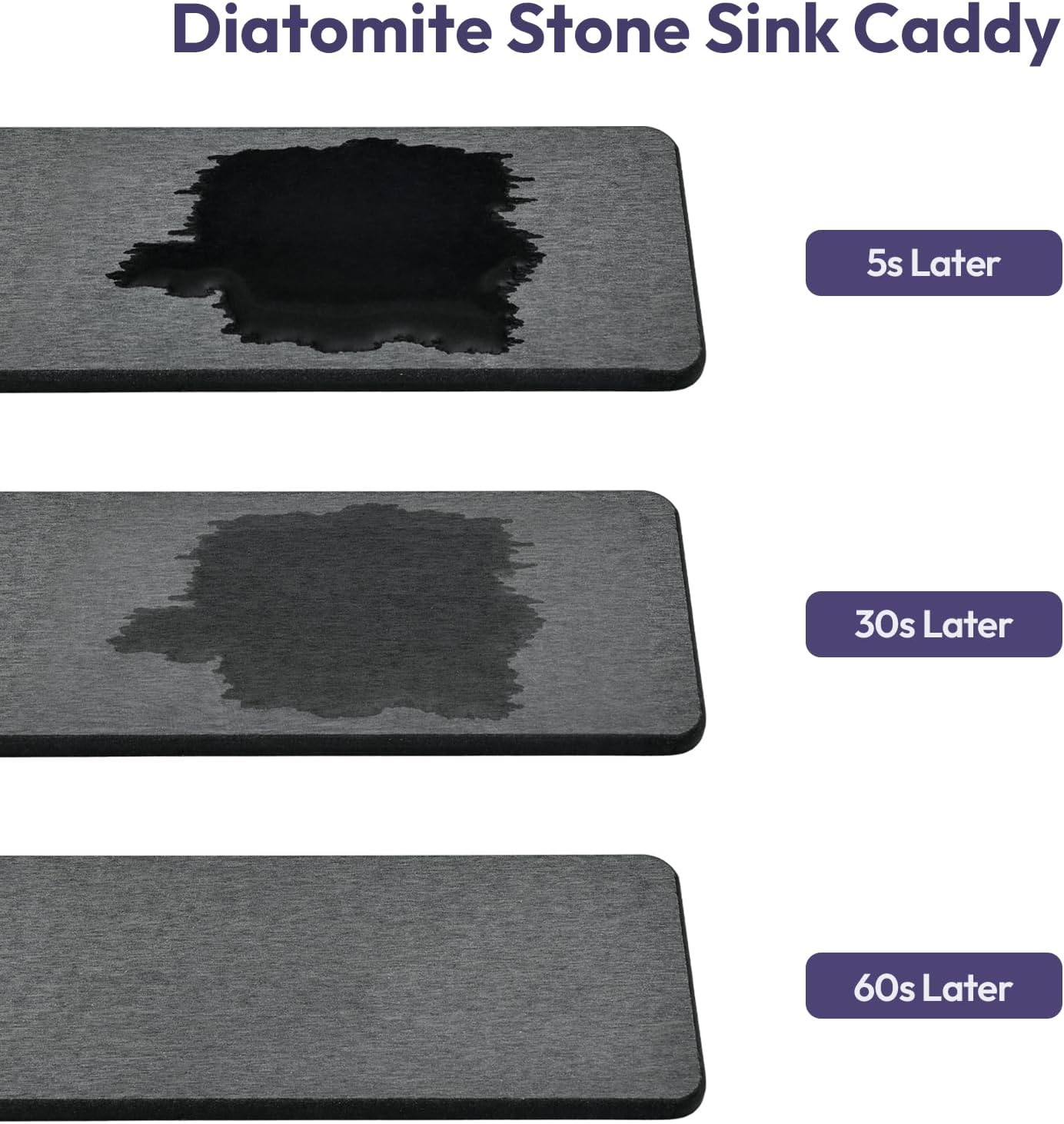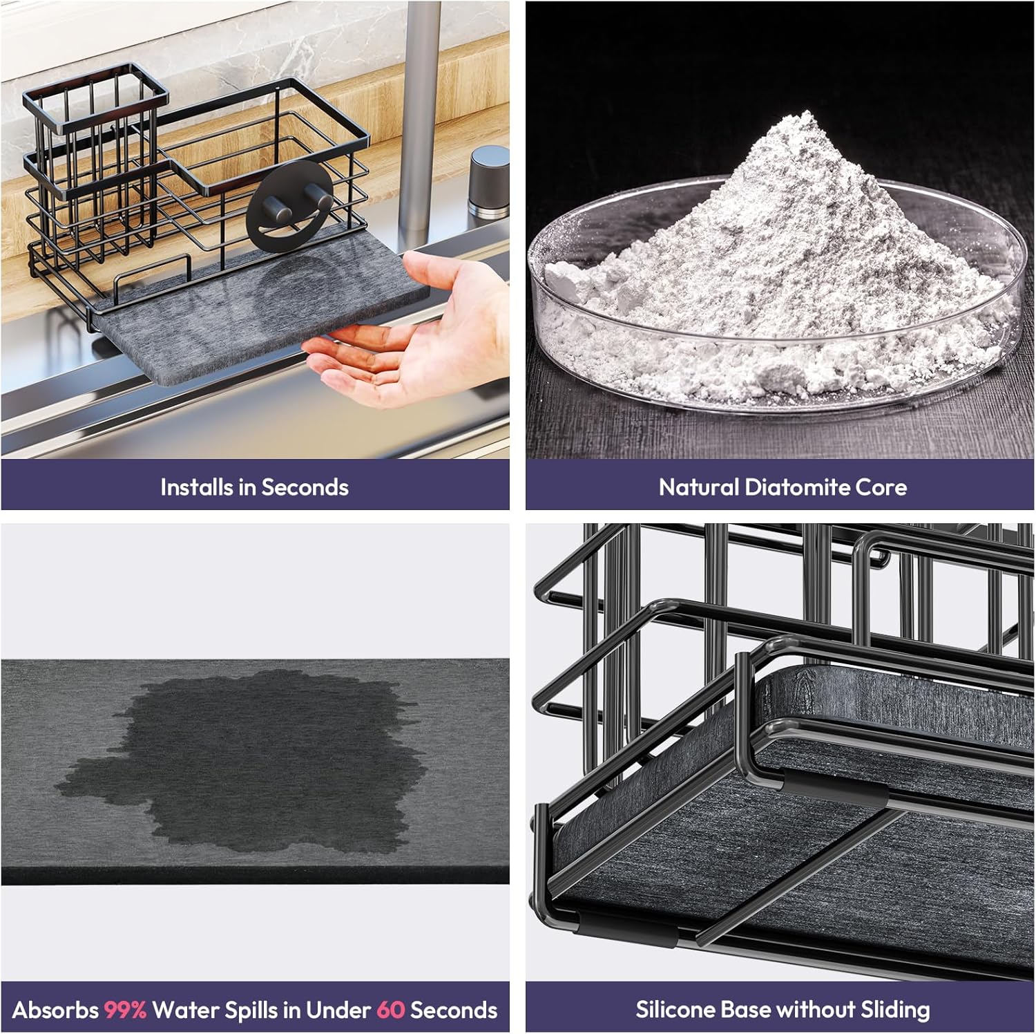 - [Instant Drying with Diatomite Pad] : Unlike typical sink caddy kitchen sink organizer, this sponge holder features a fast-absorbing diatomite drying pad that eliminates standing water within 60 seconds
