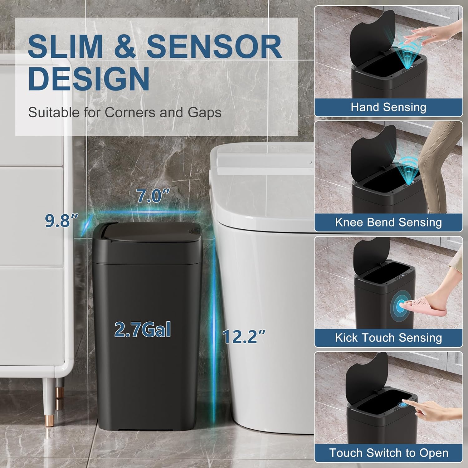 - 【SPACE SAVING & EASY TO USE】 The 2.7 Gal Slim Bathroom Trash Can fits perfectly in narrow spaces. Measuring 7.0" W, 9.8" W, 12.2" H maximizes indoor space utilization. It's suitable for use in bathrooms, kitchens, bedrooms, living rooms, offices, dorms, and more.