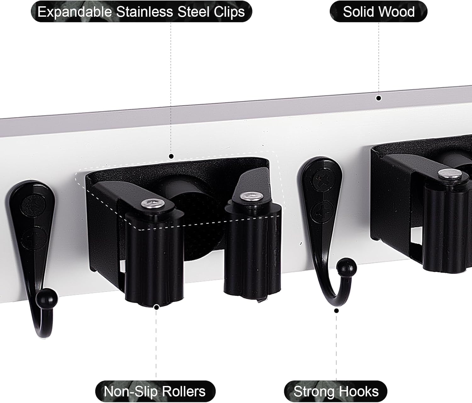 - Effective Space-Saving: This wall-mounted broom and mop holder keeps your brooms, mops, umbrellas, vacuum and other long-handled tools neatly organized on the wall. It's perfect for keeping all your tools in order and saving space, especially for those who want to keep their laundry room tidy and clutter-free.