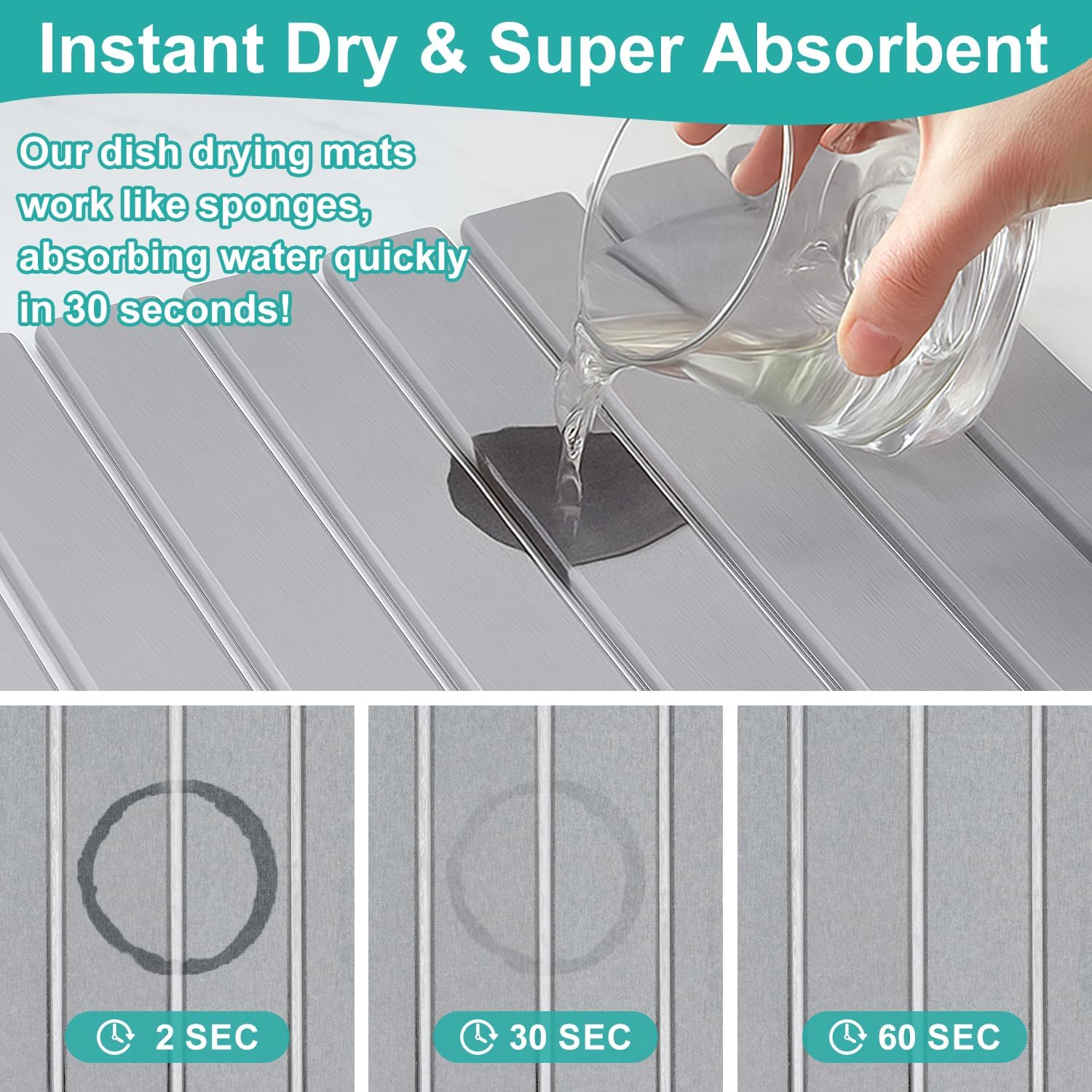 - Food-Grade & Fast Dry Material: Made from high-quality and non-toxic diatomaceous earth, this diatomite dish drying mat's highly absorbent material quickly soaks up water, and makes drying dishes and cups very easy — while keeping your countertop dry with no wet mess.