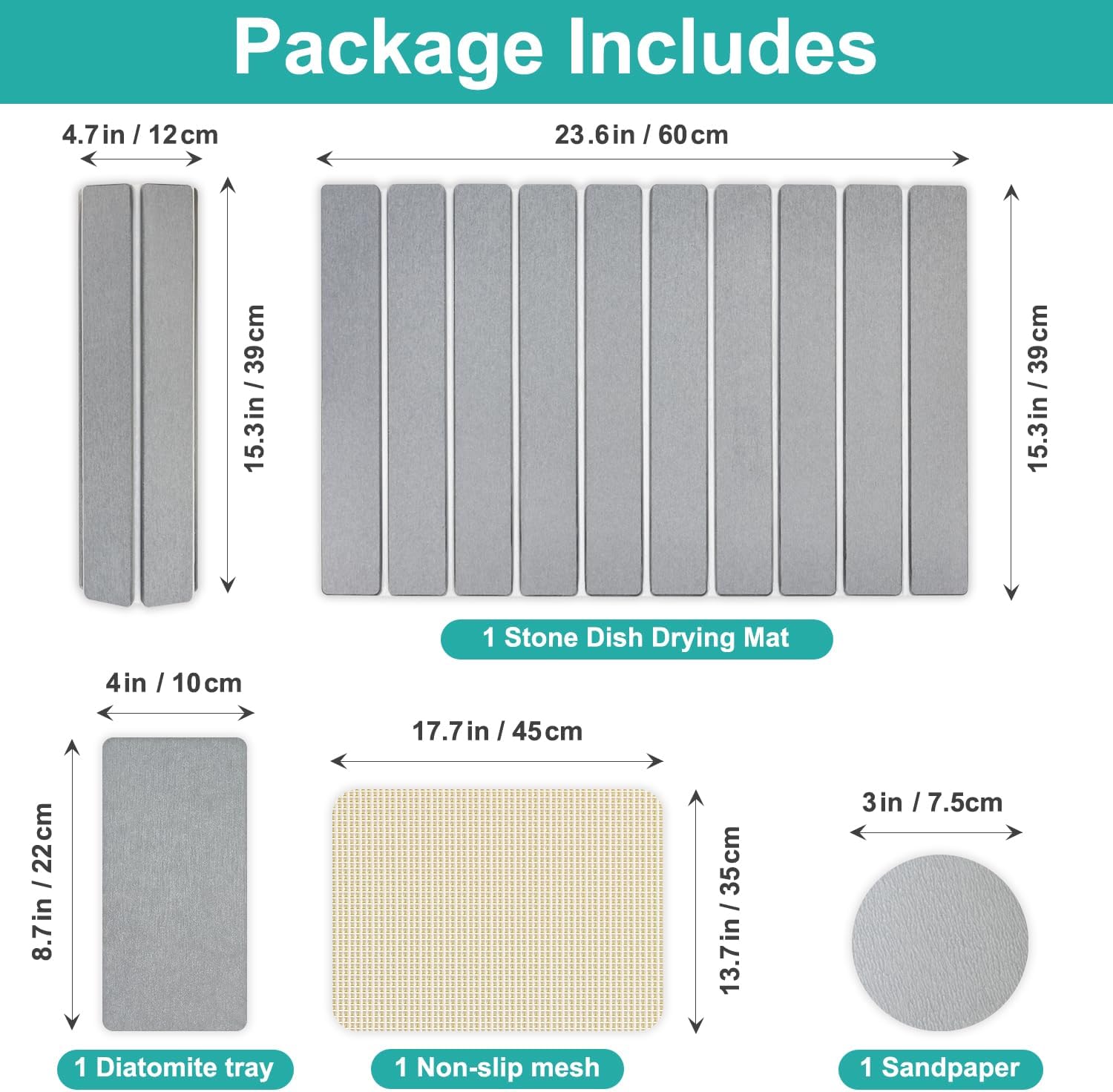 - 3 Pack Drying Stone Mats Set: You’ll receive one 23.6" x 15.3" large stone dish mat & 2 small stone drying trays, 1 sandpaper, and 1 non-slip pad.